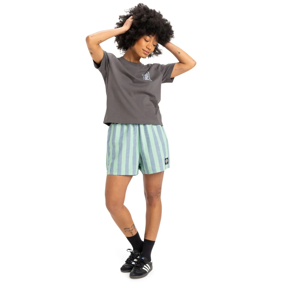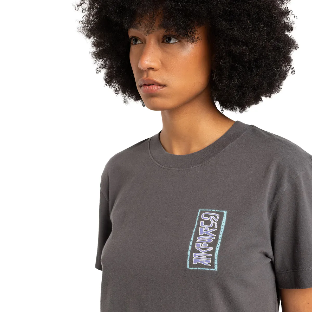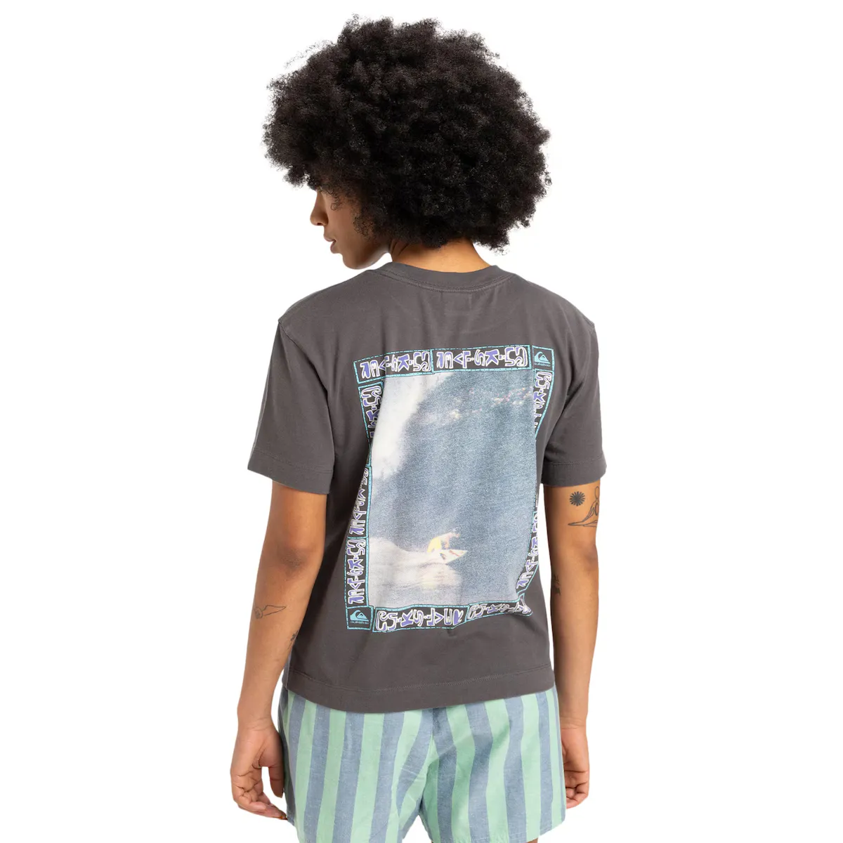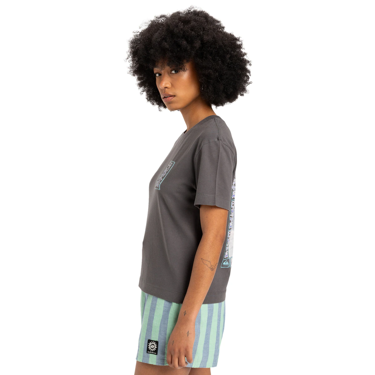 Футболка с коротким рукавом для женщин. Характеристики: Коллекция: Коллекция Global Heat, Ткань: 100% органический хлопок [160 г/м2], Стирка: Интенсивная стирка для винтажного вида, Крой: обычный укороченный, Воротник: Круглый воротник, Рукава: Короткие рукава, Бренд: художественные детали Quiksilver сезона на груди и спине, Висячая этикетка из переработанной ткани с логотипом на боковом шве, Другие характеристики: Рибана 1x1 на воротнике и Made Better.