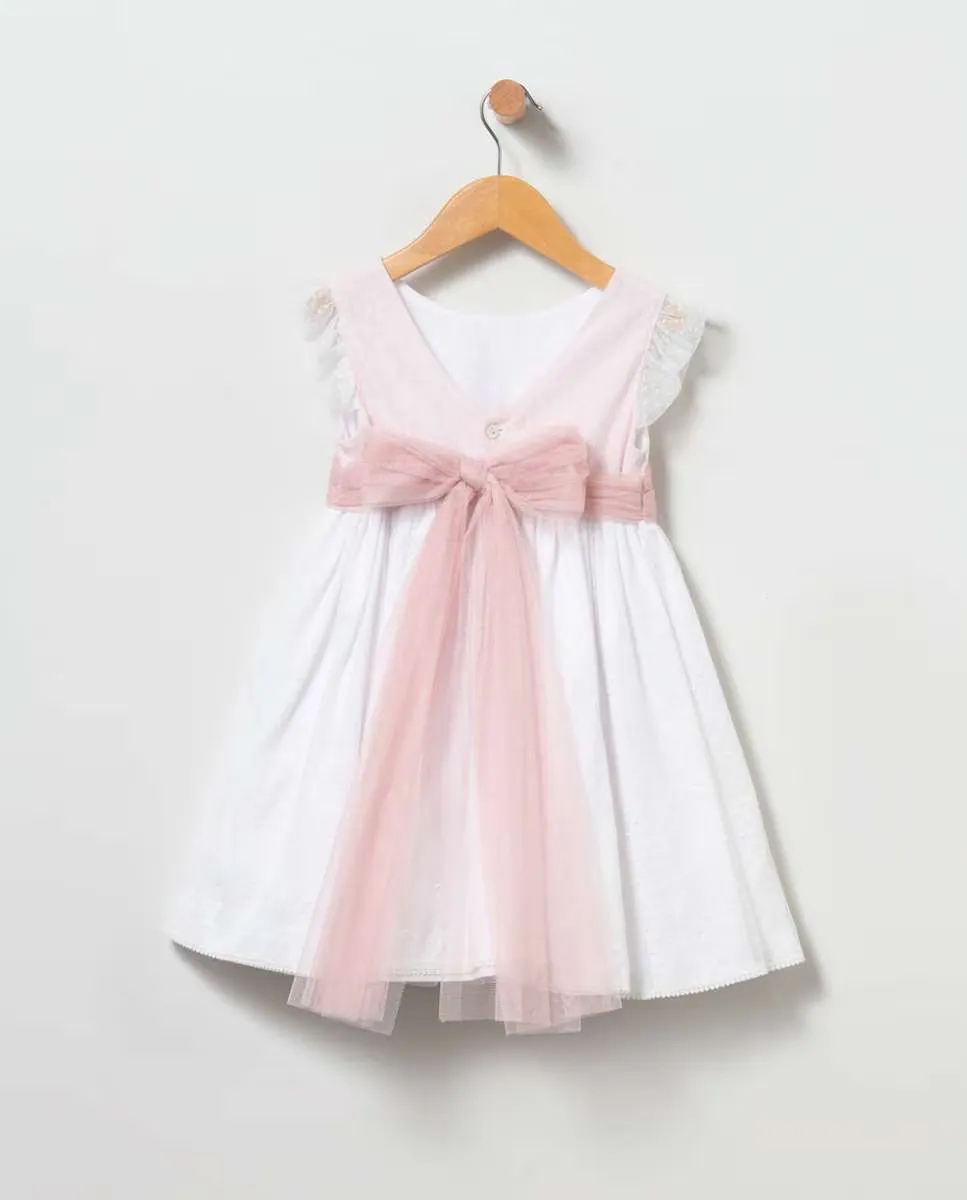 Безрукавное платье из тюля. Тюлевый пояс с бантом на спине в цвете магнолии.