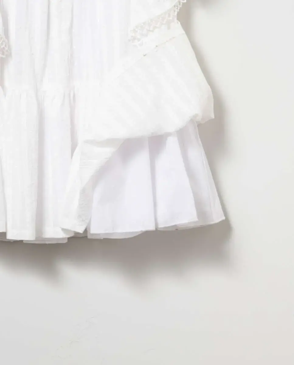 Платье из плиссированной ткани белого цвета. Рукава с рюшем и кружевом.