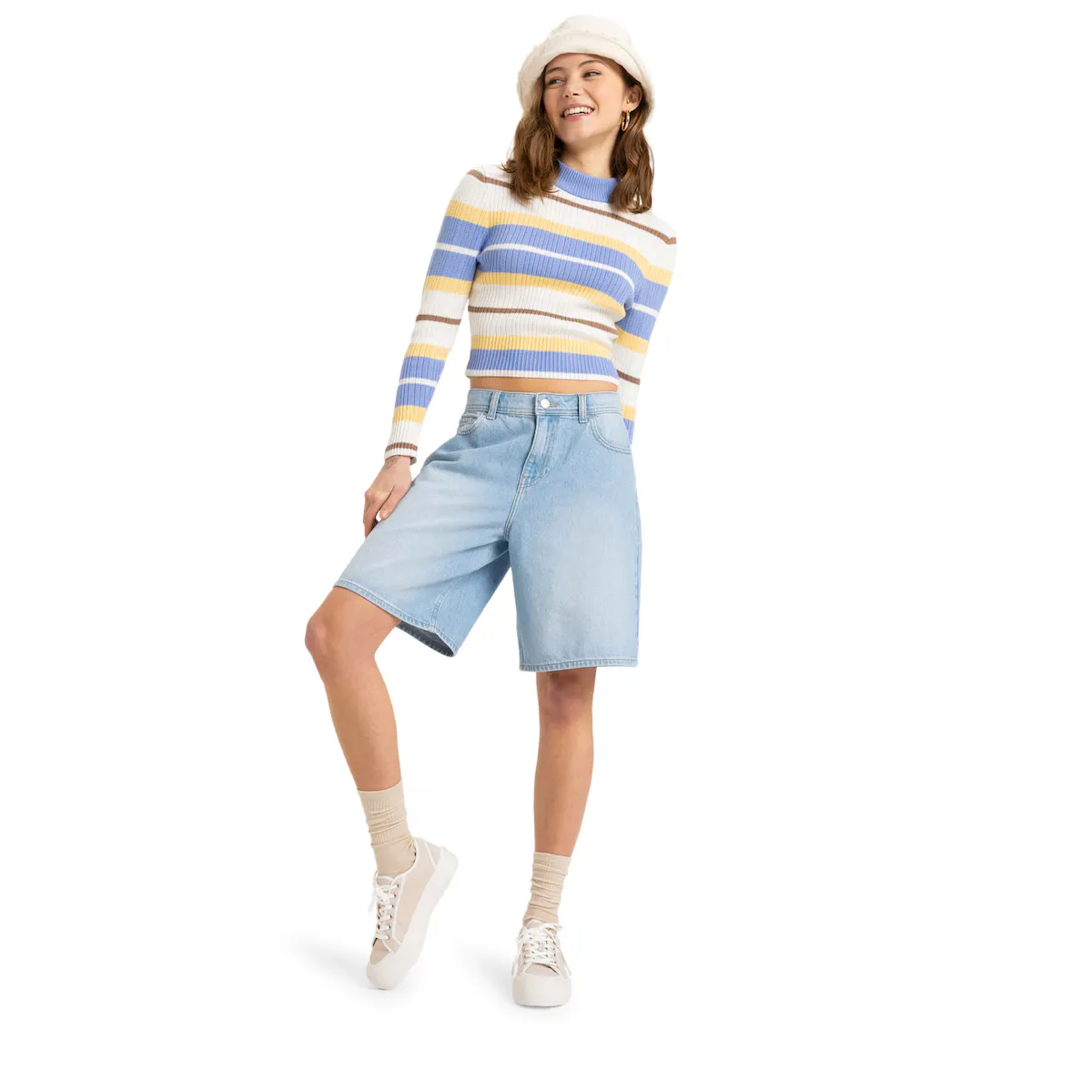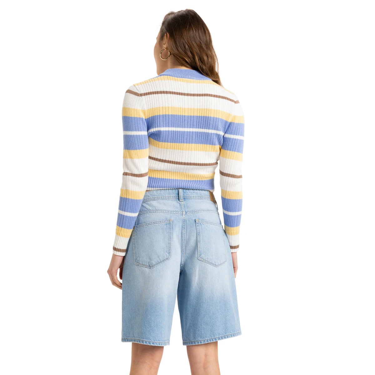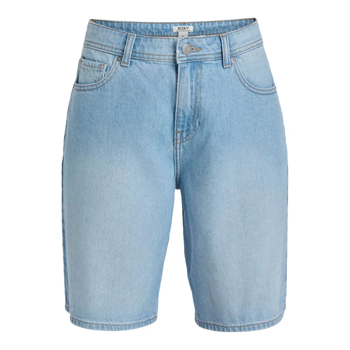 Короткие бермуды-вайкеро для женщин. Особенности включают: Ткань: семеновидный джинсовый материал с содержанием 80% хлопка и 20% переработанного хлопка [12,40 унций], крой: свободный крой, Талия: обычная талия, Пояс: фиксированный пояс, Застежка: застежка с эластичной лентой спереди и классическими металлическими пуговицами, Пояс: молния, Карманы: пять карманов и Другие особенности: детали с металлическими заклепками.
