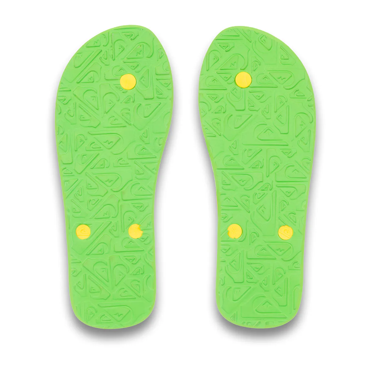 Сандалии для мужчин. Характеристики включают: Верх: синтетический материал, Стелька: нескользящая стелька с текстурой, Ремешки: гибкий ремешок из синтетической резины с тремя точками, Подошва: резиновая подошва с противоскользящей текстурой с многоугольными выемками и логотипом для лучшего сцепления, Подкладка: тонкие линии в координатах поп-цветов по бокам подошвы и Бренд: надпись Quiksilver и логотип Mountain Wave.