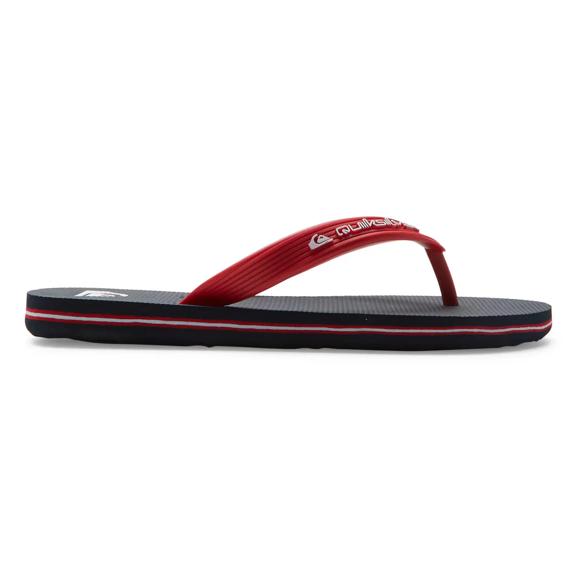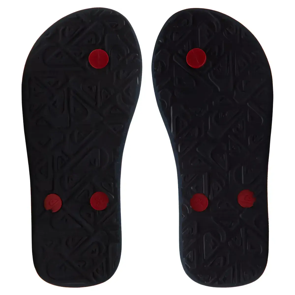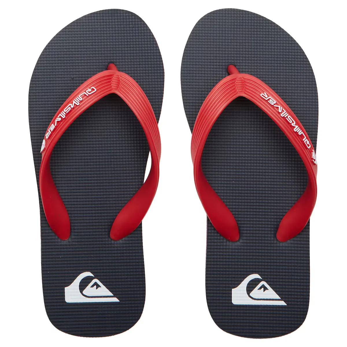 Шлепанцы для детей. Характеристики включают: Верх: синтетический материал, Стелька: противоскользящая стелька с текстурой, Детали верха: резиновый синтетический и гибкий ремешок на три точки, Подошва: резиновая подошва с многогранными выемками и логотипом для лучшего сцепления, Бренд: надпись Quiksilver и логотип Mountain Wave, а также другие характеристики: тонкие линии ярких цветов, согласованные по бокам подошвы.