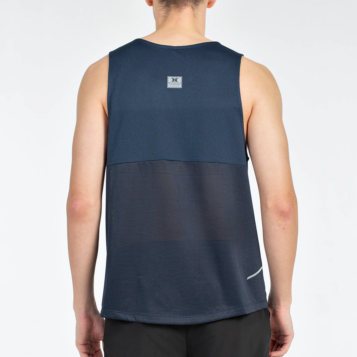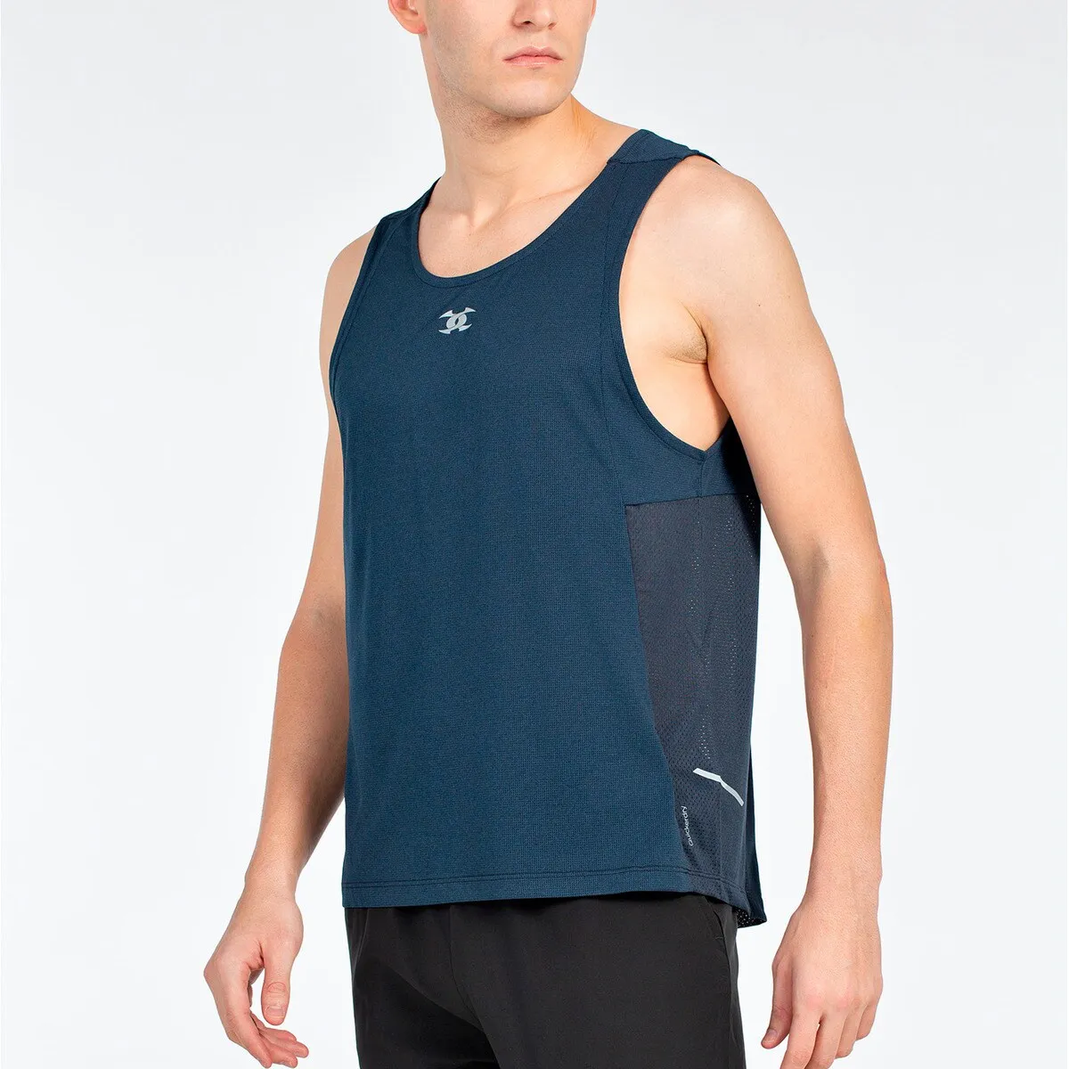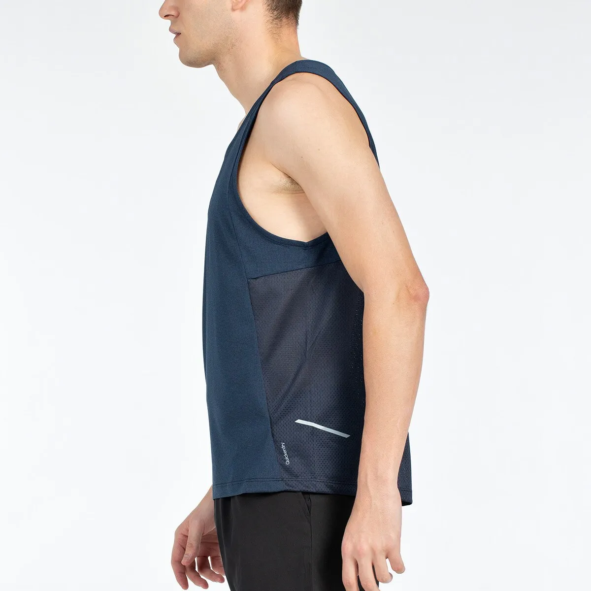 Футболка на бретелях с эластичным круговым вырезом. Сетчатая вставка на спине и контрастное обрамление под проймами, отражающие детали. Ткань из жаккардового полиэстера с отделкой Quickerdry.