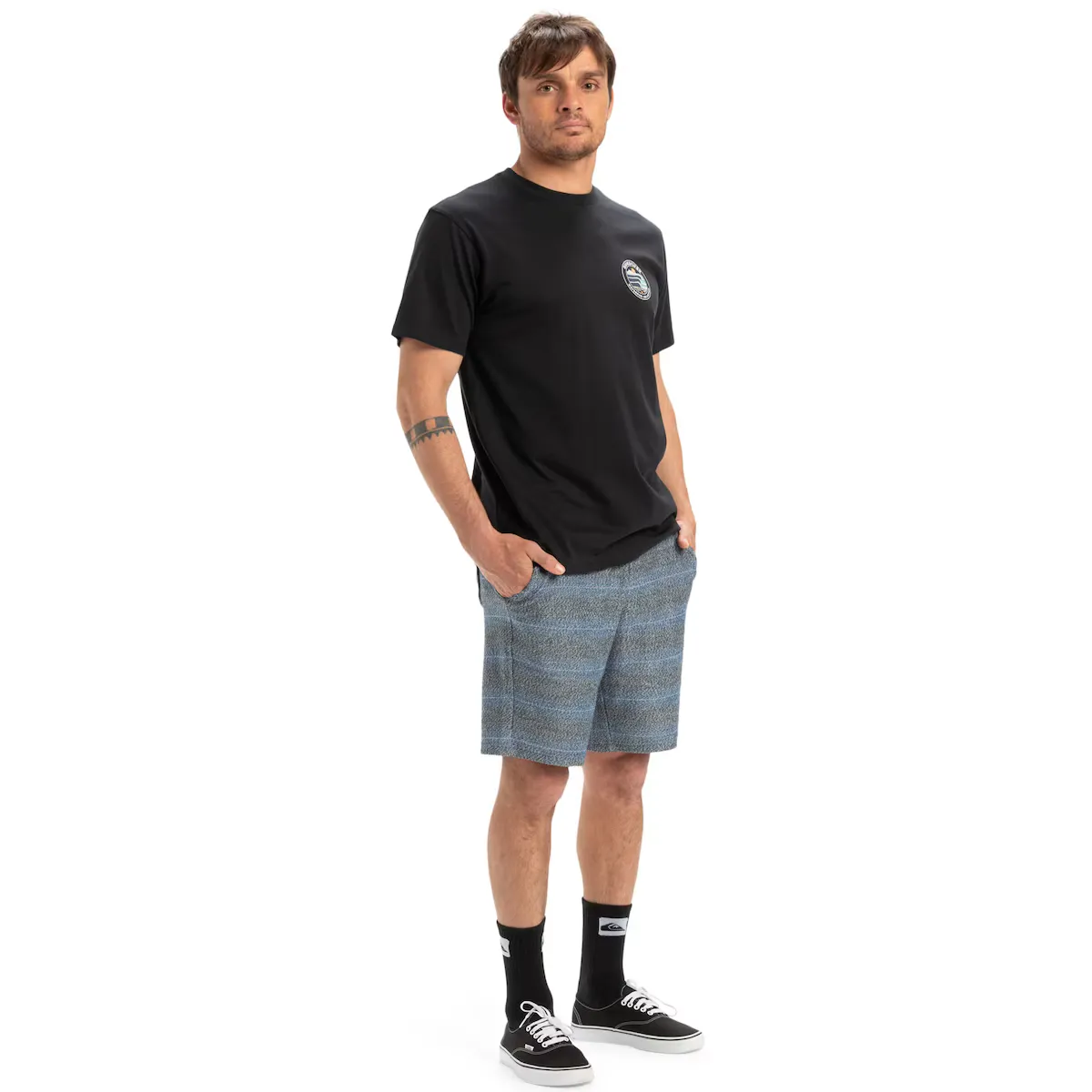 Шорты с эластичным поясом для мужчин. Особенности включают: Ткань: обратная ткань терри с mezcla algodón y poliéster, окрашенная в нить (280 г/м2), Крой: обычный крой 19', пояс: эластичный пояс, Застежка: регулируемая застежка с хлопковым шнурком, Карманы: правый и задний накладной карман с застежкой на кнопку, боковые карманы, Бренд: художественные детали Quiksilver на левой ноге и упаковка этикеток Quiksilver.