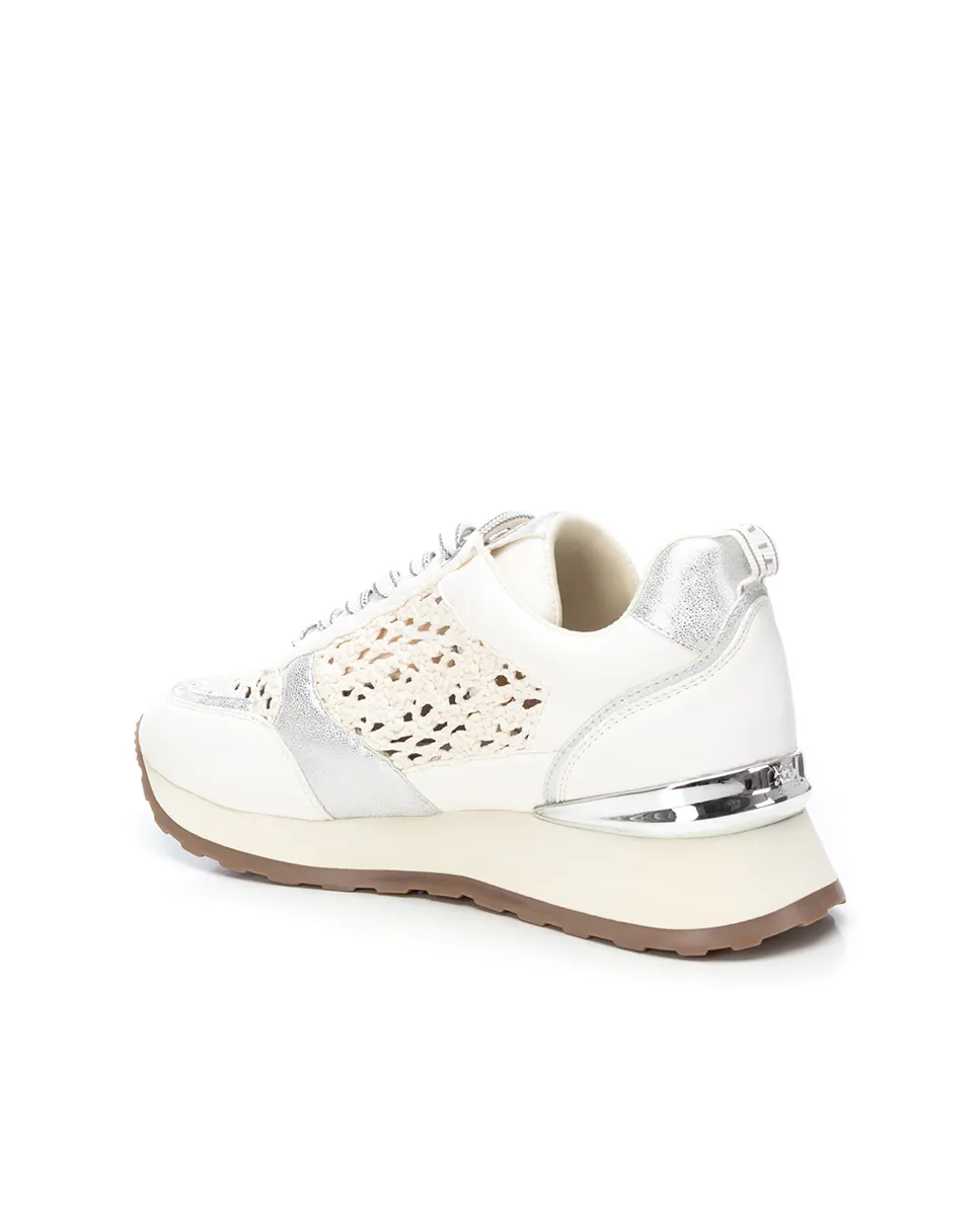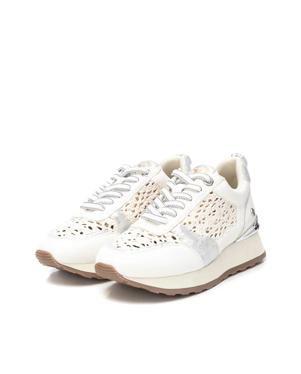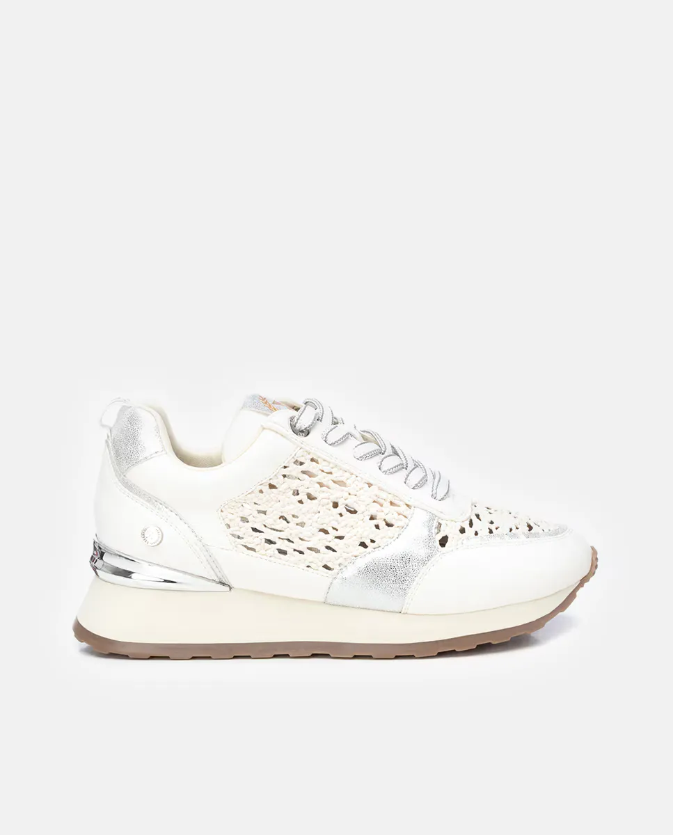 Женские кроссовки бренда Xti. Изготовлены из материала, имитирующего кожу, комбинированного с металлическими вставками и рафией. Застежка на шнурках с деталями в тон кроссовок. Супер удобные и элегантные для повседневной носки. Непоскользящая подошва с металлической деталью на пятке. Съемная стелька. Эта модель получила веганский сертификат от Всемирной организации PETA (Организация по защите прав животных).