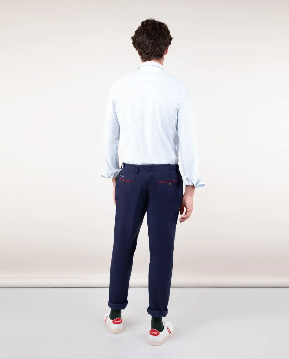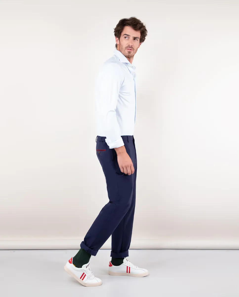 Однотонные мужские брюки, изготовленные с использованием технологии Sepiia из 100% перерабатываемого технического полиэстера с антимикробными свойствами. Slim Fit, классическая талия спереди и эластичная спина для большего комфорта. Имеет боковые и задние карманы с окантовкой. Доступен соответствующий пиджак. Эти ткани были произведены в Испании, а одежда сшита в Португалии с учетом устойчивого развития.