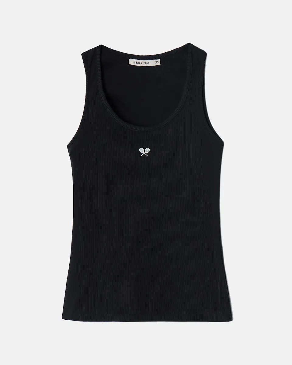 Футболка, сшитая на 100% хлопке с Slim fit кроем. Имеет черные танковые straps с рибаны и вышитым логотипом ракетки в центре контрастного белого цвета. Изготовлено в Португалии.