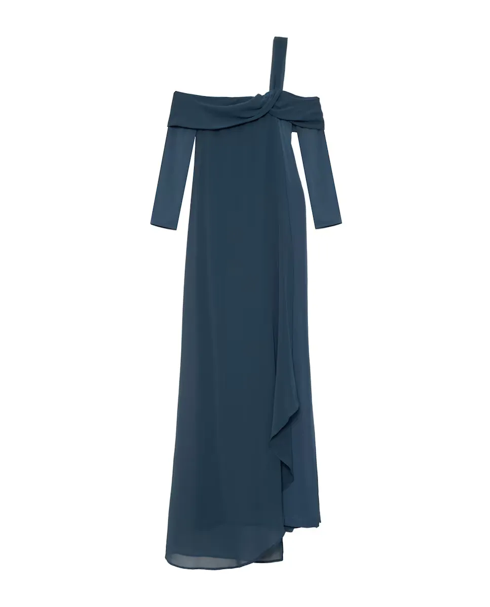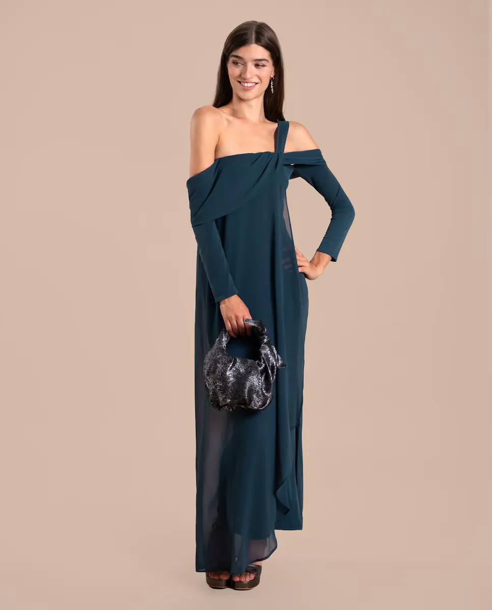 Миди-платье с длинными рукавами и декольте-бандо, идеально подходит для гостей, которые ищутSophisticated and original look. Этот дизайн выделяется своим сочетанием платья из трикотажа, дополняемого шифоновой накидкой, которая придает плавность. Накидка свисает с одного плеча, образуя асимметричный ремешок с тонким узлом. Резинка в области груди для лучшей поддержки. Без молнии.