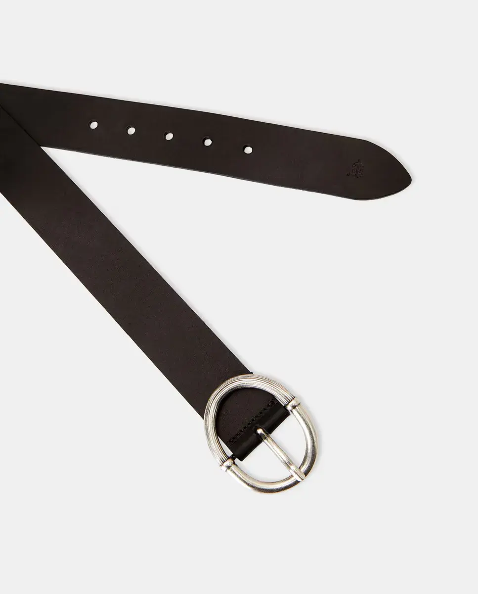 Плоский кожаный ремень с двойной металлической пряжкой.
