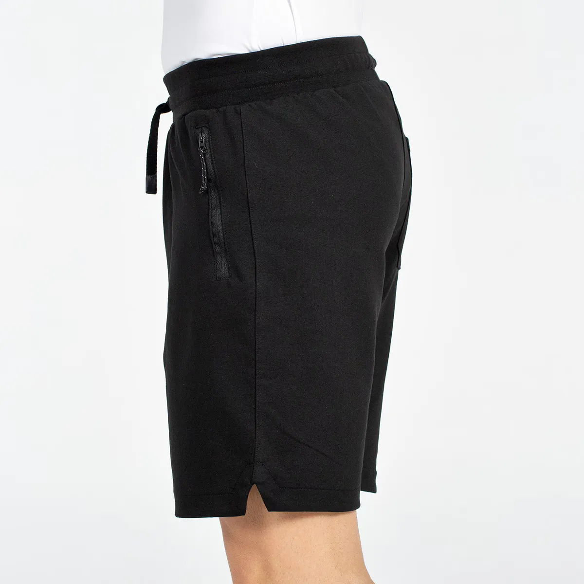 Бермуды с эластичной каниной и внутренним шнурком для регулировки. Боковые карманы с молниями и вышитым логотипом. Изготовлены из французского терри из хлопка и полиэстера.