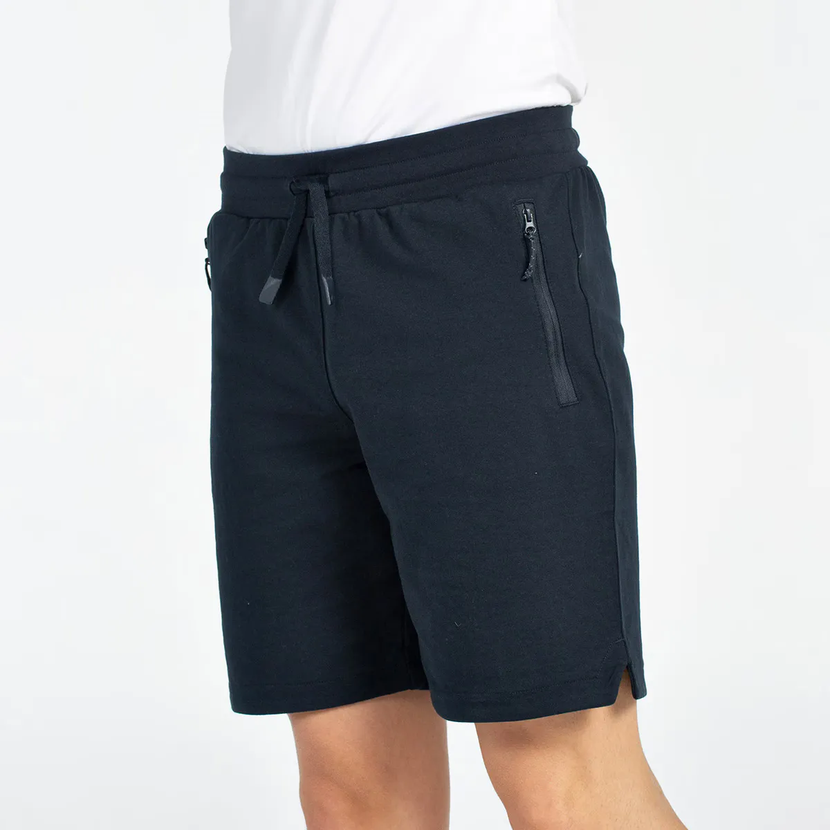 Бермуды с эластичной талией и внутренним шнурком для регулировки. Боковые карманы с молниями и вышитым логотипом. Изготовлены из французского терри из хлопка и полиэстера.