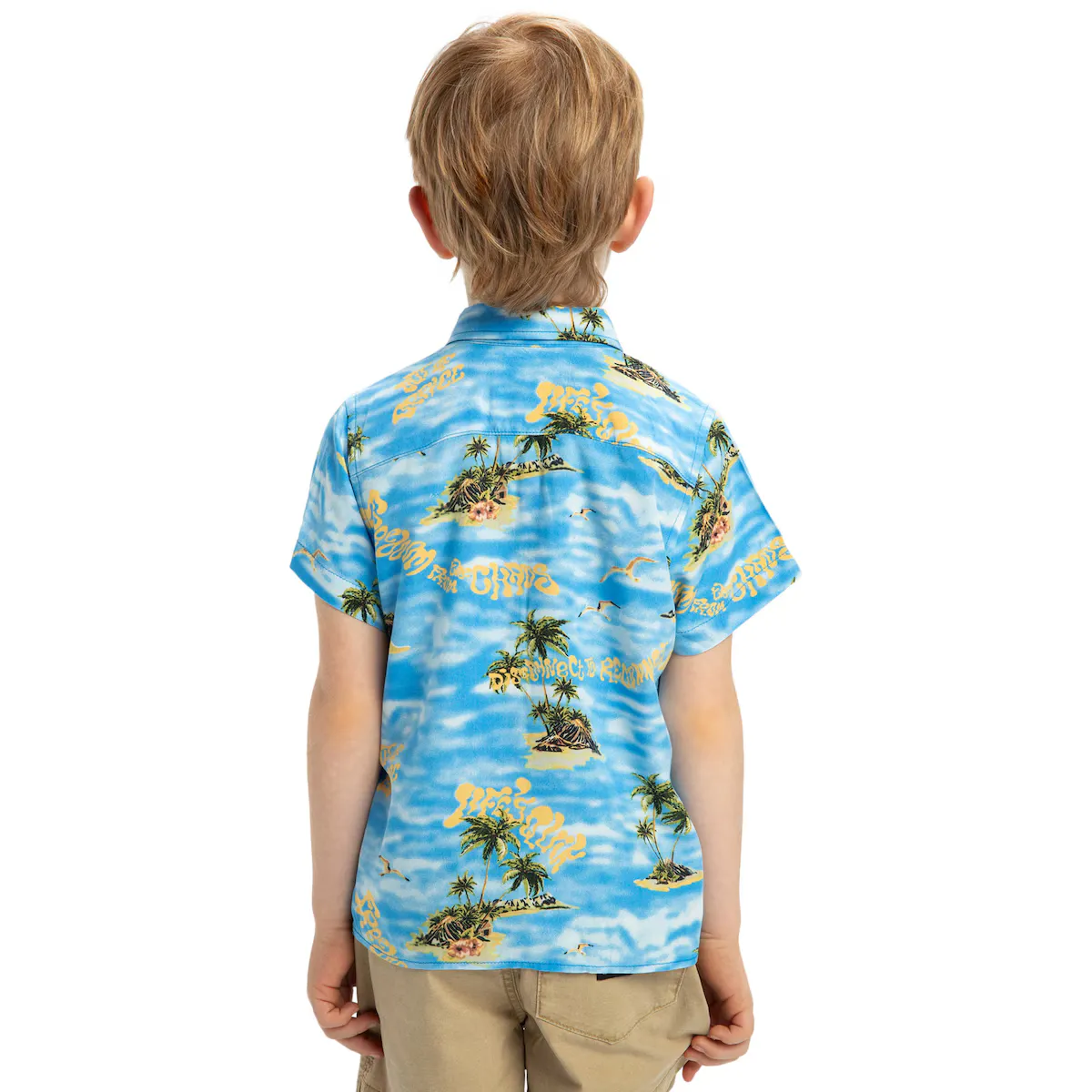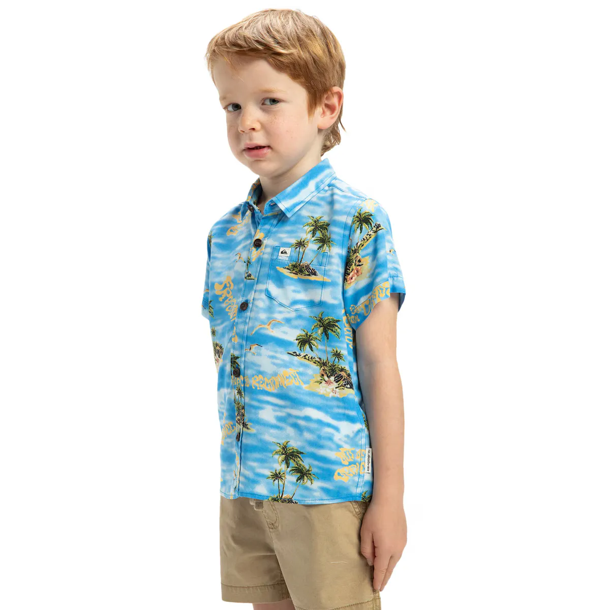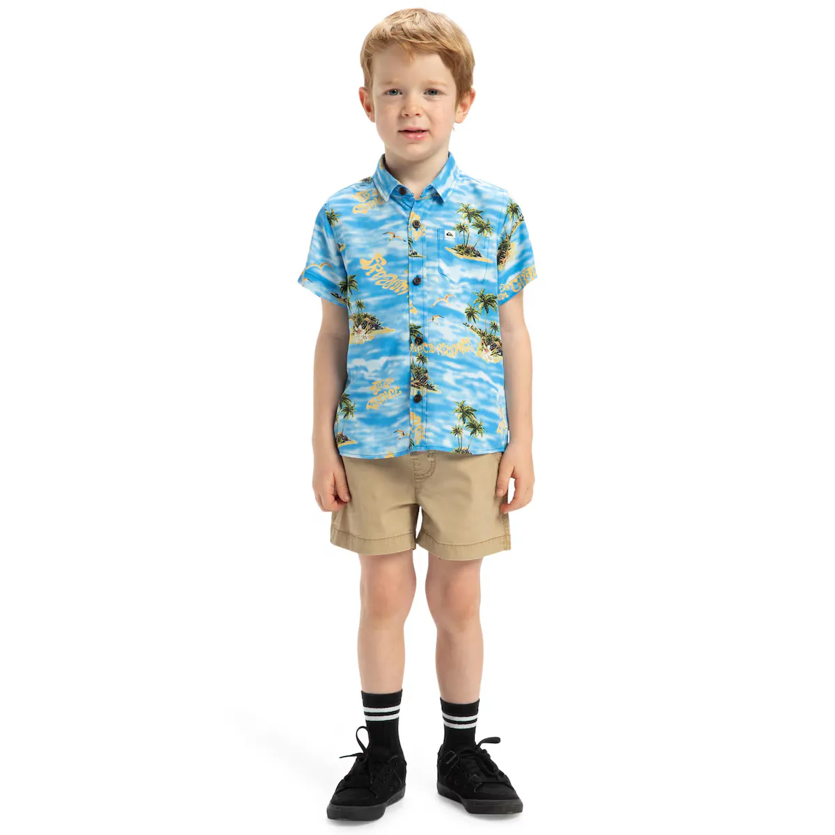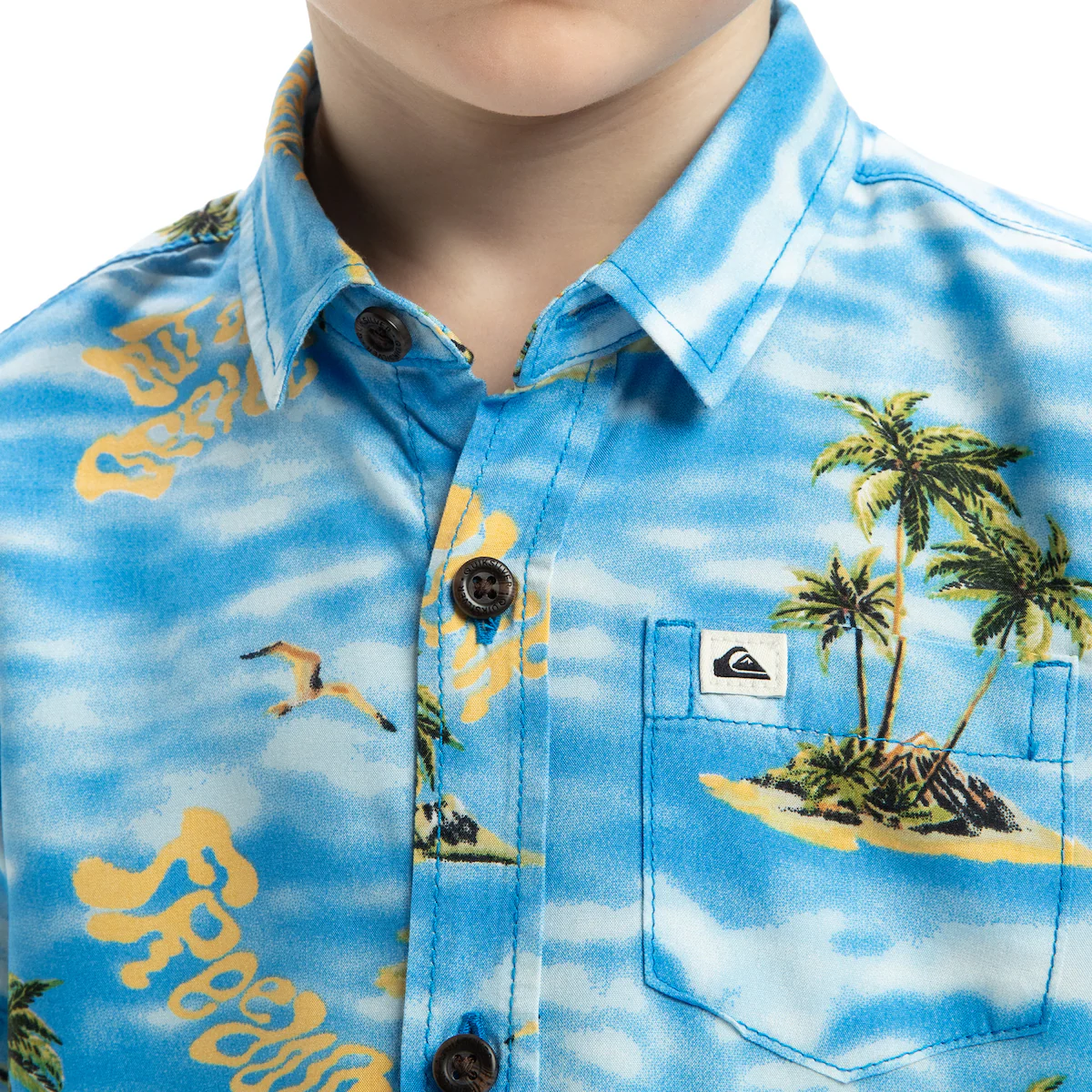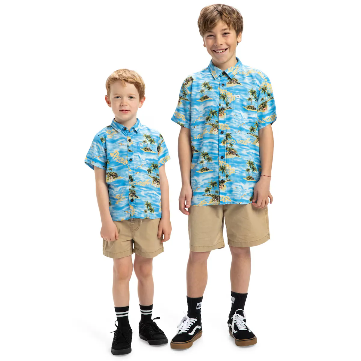 Рубашка с коротким рукавом для мальчиков 8 - 16 лет. Характеристики: Материал: ткань Ecovero из вискозы, Стирка: стирка в изделии, Крой: обычный, Воротник: классический воротник, Рукава: короткие рукава, Карманы: один карман на груди, Застежка: застежка на пуговки, Бренд: лейбл Quiksilver на кармане и боковом шве, Другие характеристики: волнистый подол и Made Better.