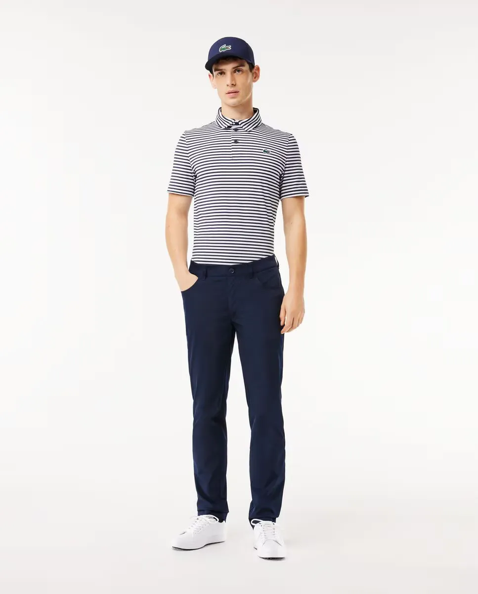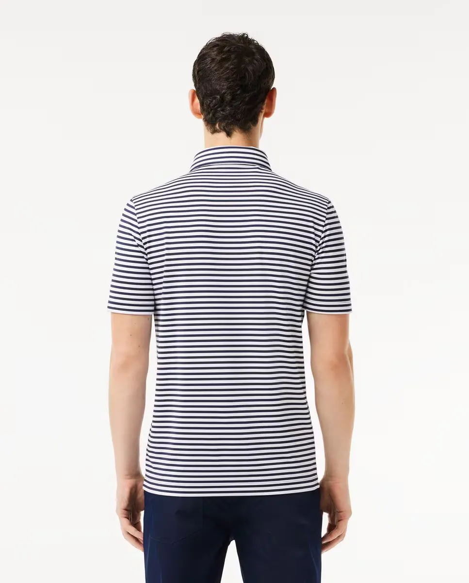 Поло Lacoste сшито из ультра-сухой технической ткани. Имеет ребристый воротник-поло и планку с контрастной застежкой на пуговицы. Жесткий крокодил, пришитый к воротнику.