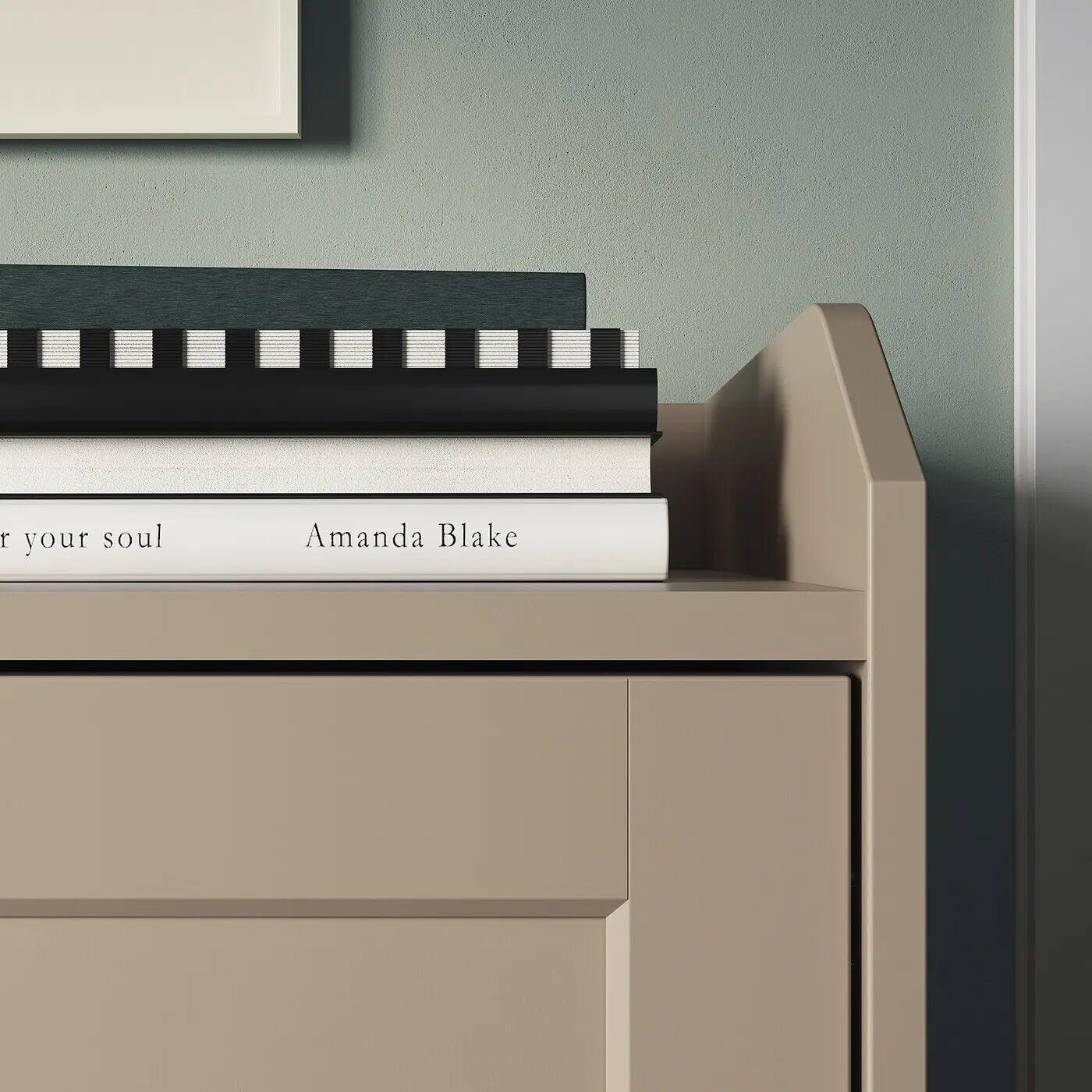 Характерная верхняя полка является общей чертой всей серии HAUGA и дополняет традиционный стиль. Независимо от того, используете ли вы ее для шляп, коробок или украшений, край удерживает ваши вещи на месте.