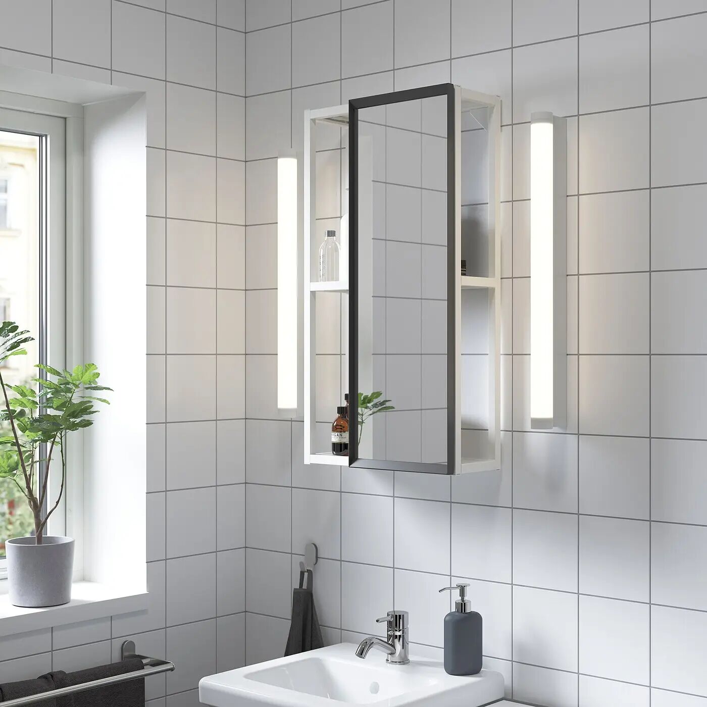 Подвесное зеркало ENHET для рамы легко крепится к настенной раме, так что вы можете наслаждаться видом в кратчайшие сроки. Оно сдвигается вбок, предоставляя вам легкий доступ к вашим повседневным вещам внутри.