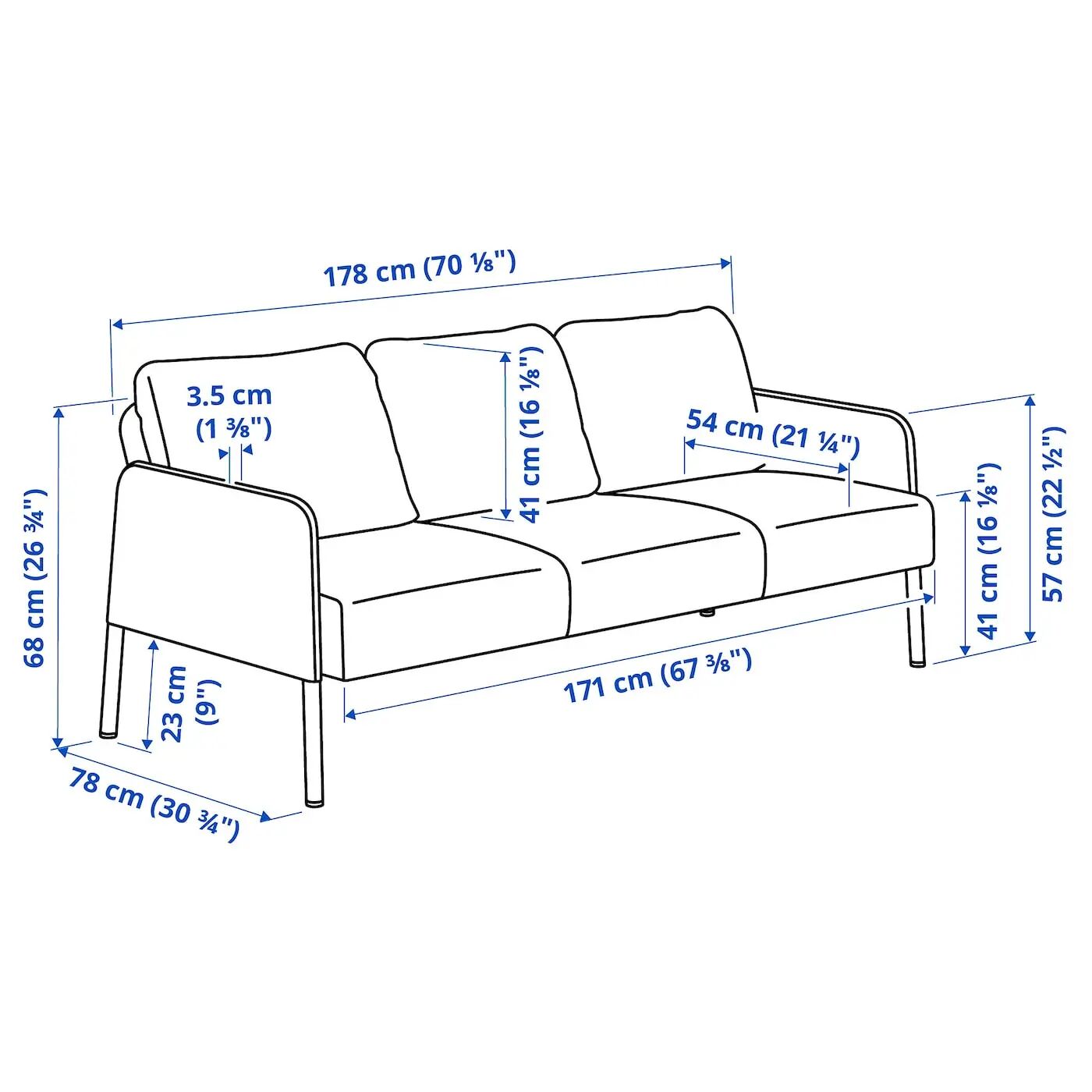 Диван GLOSTAD имеет простую конструкцию, которая в то же время удобна благодаря толстому сиденью, мягким подлокотникам и мягким подушкам спинки, которые надежно фиксируются на месте.
