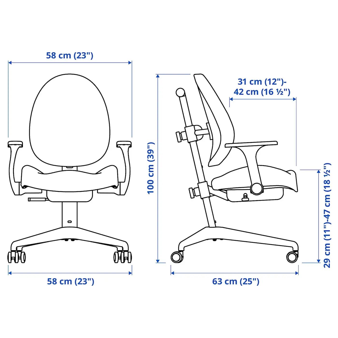 Вы можете легко отрегулировать стул на желаемую высоту как спинки, так и сиденья (от 29 см до 47 см), чтобы обеспечить эргономичное и удобное положение сидя. Подходит для детей ростом от 115 см до 185 см.