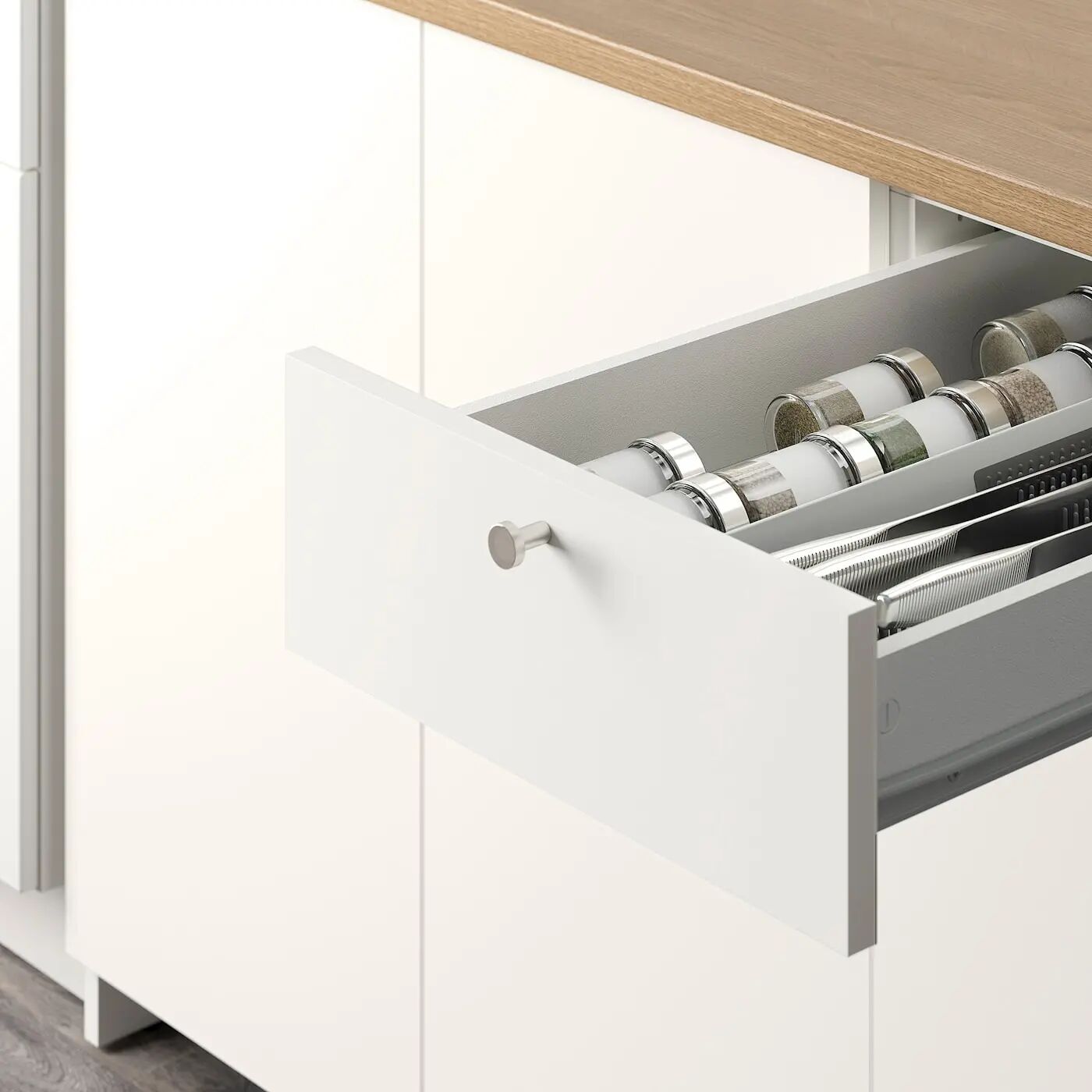 Вы можете хранить все, от столовых приборов и посуды до кастрюль, поскольку в этой комбинации есть и ящик, и шкафчики.