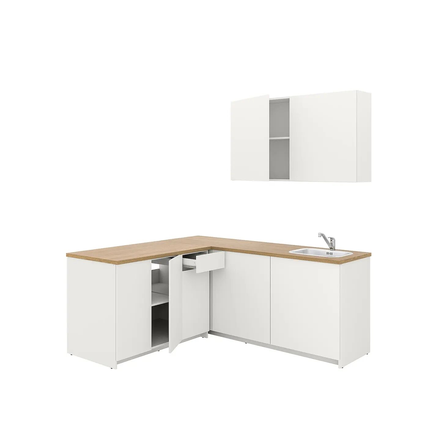 В комплекте: мойка, сифон, смеситель, шкафы, дверцы, ящик, столешница, ножки, цоколь, полки, петли и фурнитура.