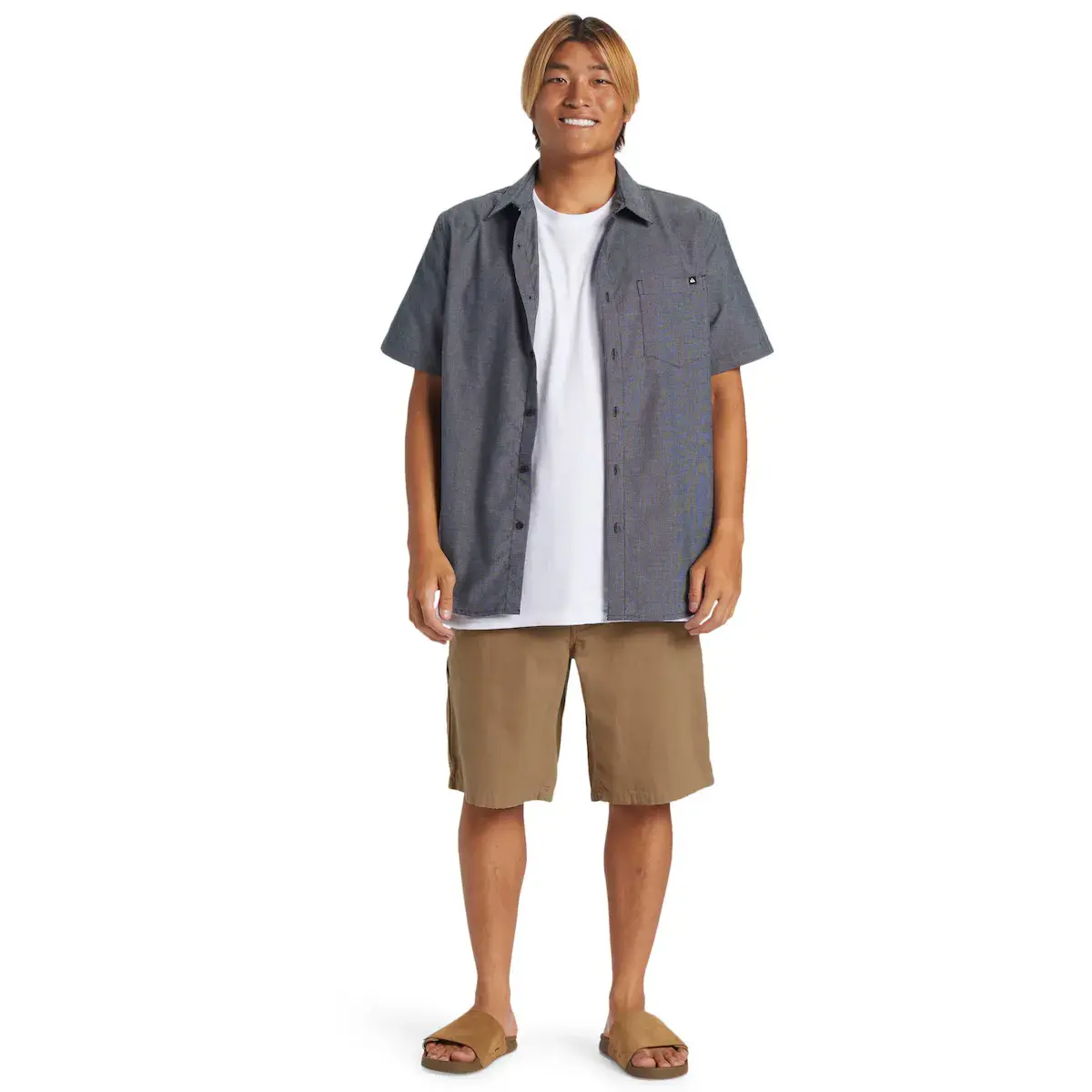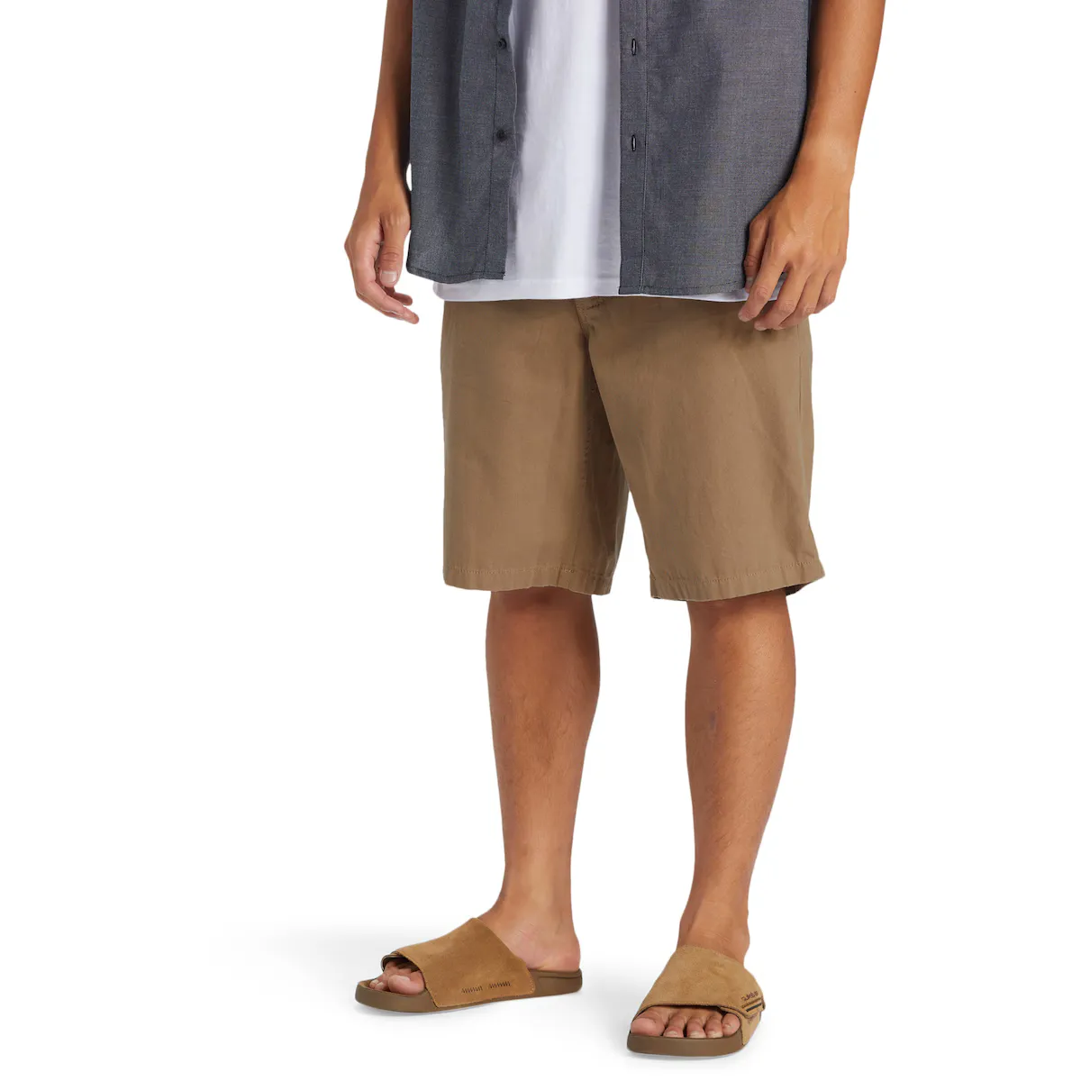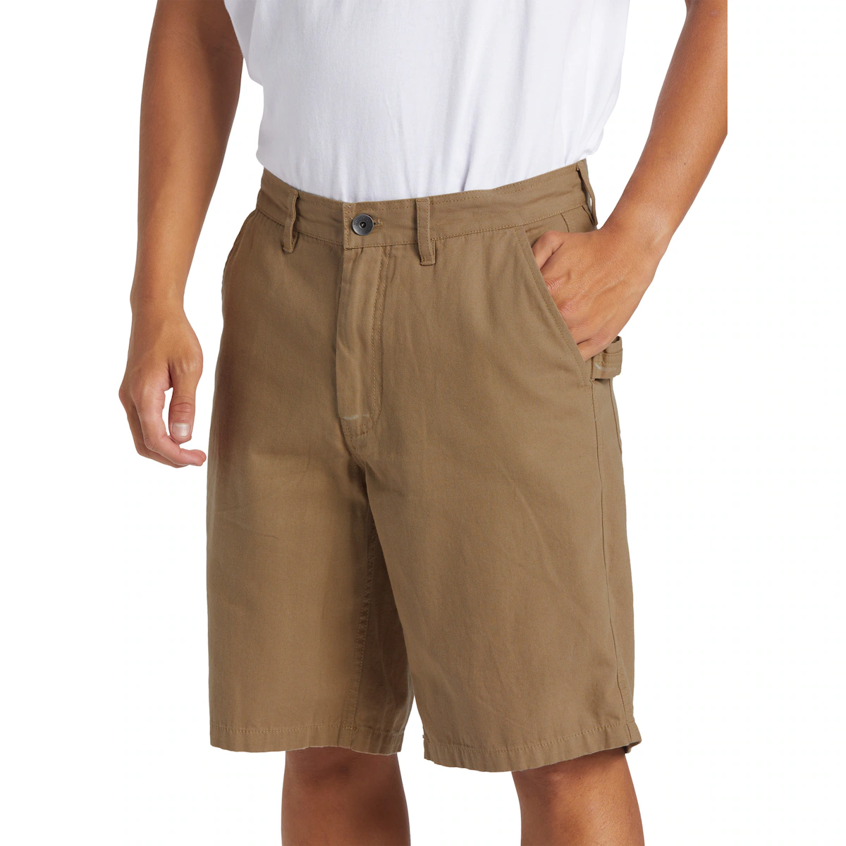 Короткие свободные шорты для мужчин. Характеристики включают: ткань из хлопкового канваса, стирка в готовом виде, широкий крой, фиксированная талия, металлическая молния и пуговица Quiksilver, косой передний карман, накладной задний карман, практичные карманы, Бренд: ярлычок на заднем кармане и другие особенности: функциональная лента для инструментов.
