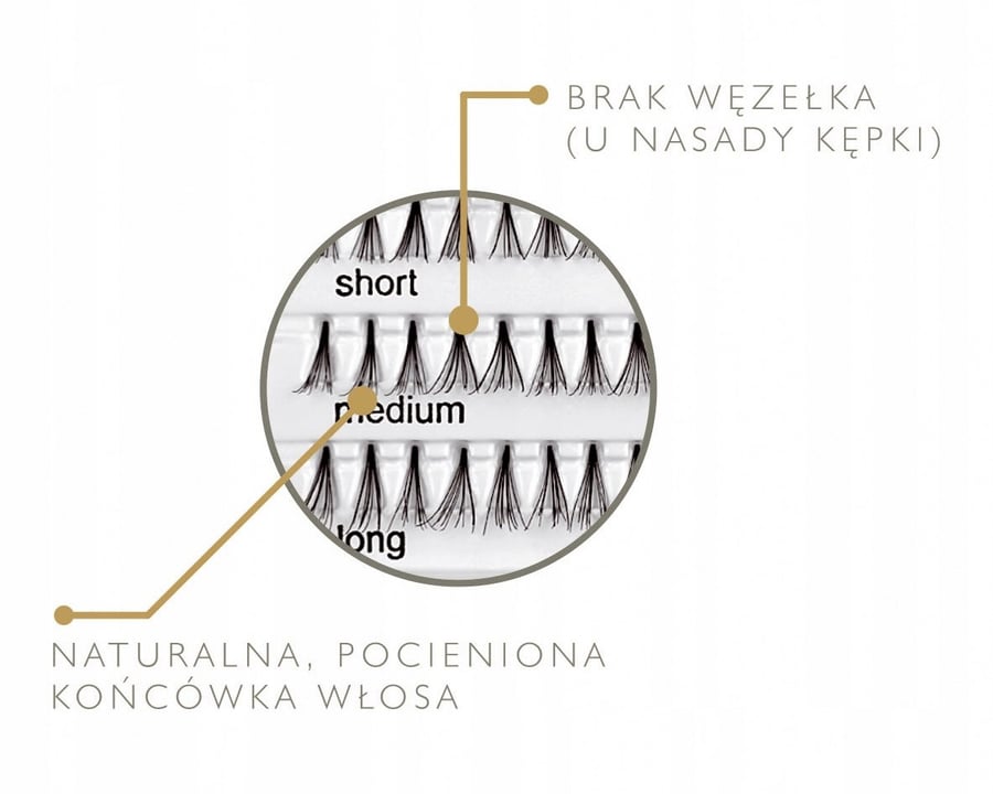 Естественный эффект гарантируется отсутствием узелков, мягкостью и легкостью ресниц. Конусообразный, затененный кончик волосков позволяет пучкам идеально сочетаться с натуральными ресницами. Они рекомендуются для любой формы глаз, повседневного и вечернего макияжа.
