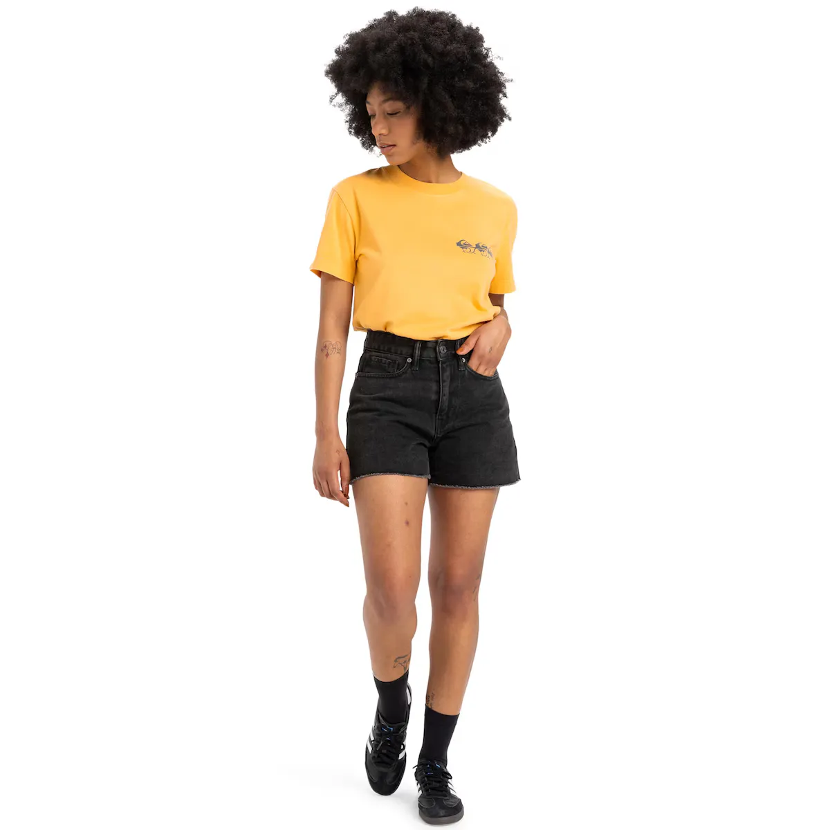 Короткие джинсы для женщин. Характеристики: Коллекция: Essentials, ткань: джинсовая ткань из хлопка, Крой: укороченный высокий крой, Талия: фиксированная талия, Застежка: молния и пуговица на талии, Карманы: 6 карманов, Бренд: вышивка логотипа над левым боковым карманом, кожаная нашивка на задней правой части талии и Другие детали: низ без подгибки.