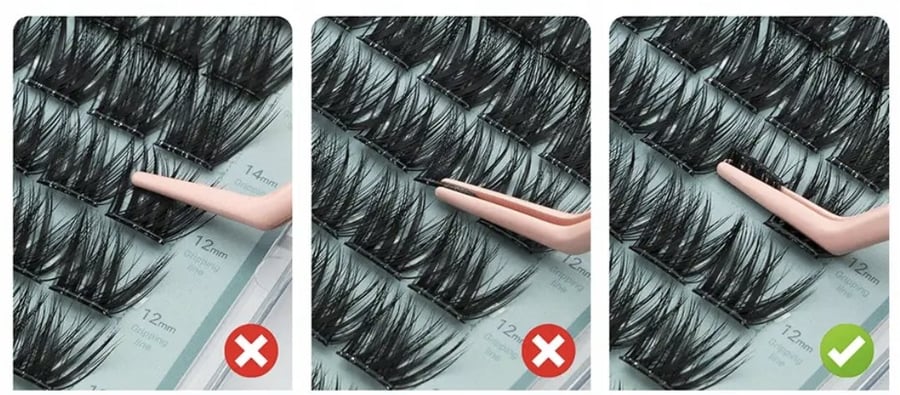 Снимите ресницы с полоски пинцетом, захватывая их за основание, а не за кончики