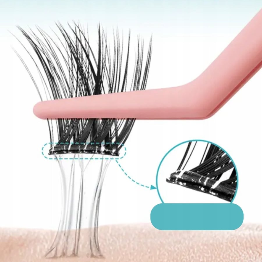Аккуратно удерживая пучок за верхнюю часть, приложите его под натуральные ресницы, оставляя зазор в 1–2 мм от века.