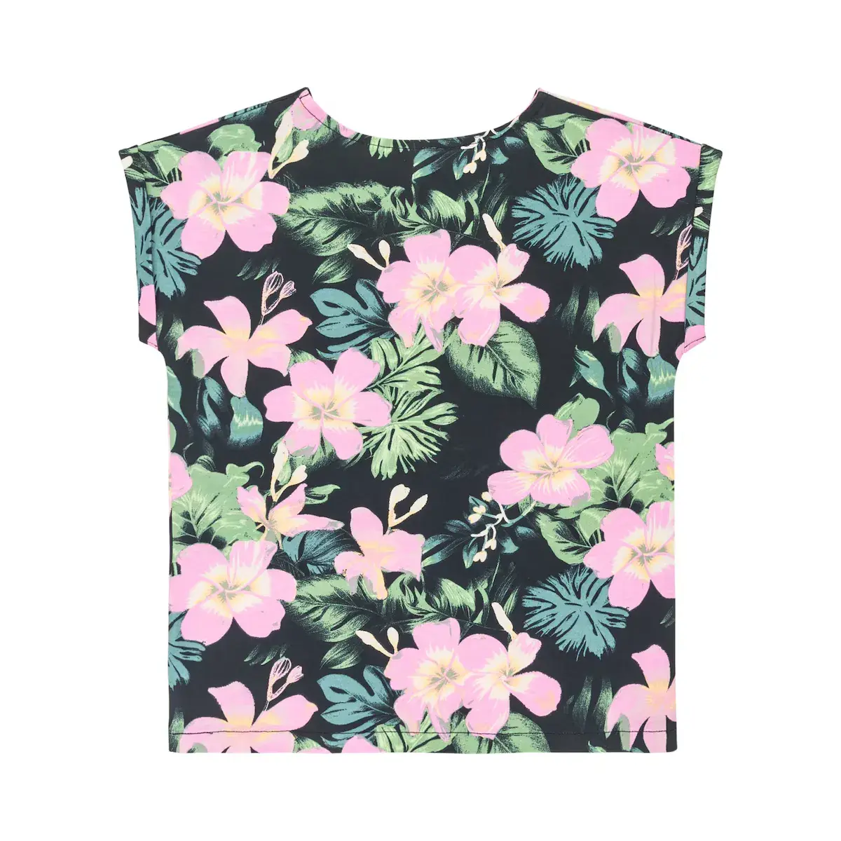 Футболка с коротким рукавом для детей (4-16 лет). Характеристики включают: Коллекция: Коллекция Injection Ecom, Ткань: Джерси из хлопка [140 г / м²], крой: обычный крой, Вырез: Круглый вырез, Рукава: короткие рукава, Застежка: без застежки, Бренд: Металлическая эмблема Roxy на нижнем левом боку и Другие характеристики: Рукава с закатанным краем.