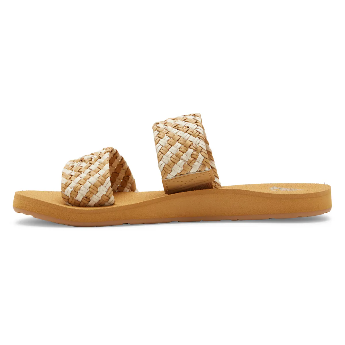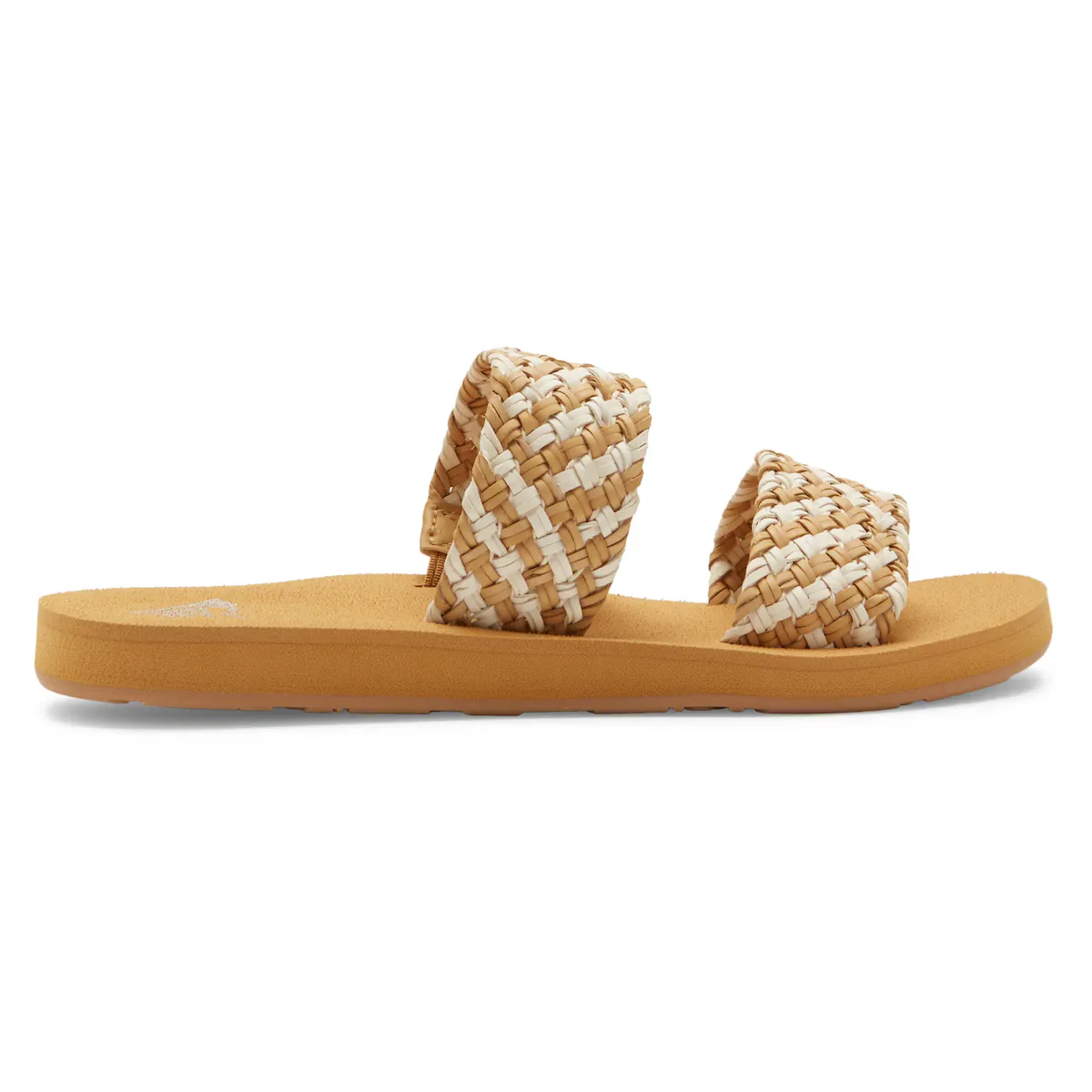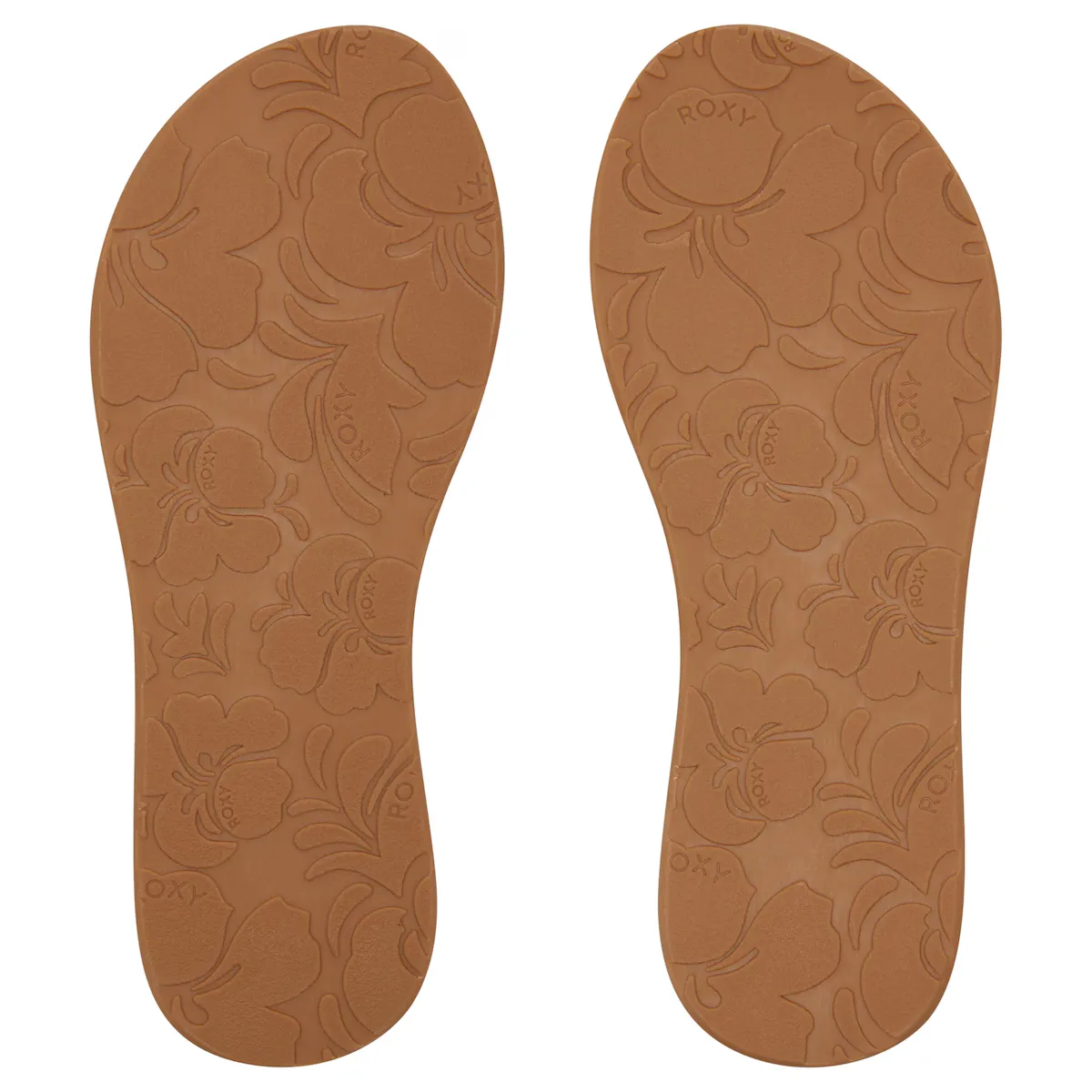 Сандалии для женщин. Характеристики включают: искусственная кожа с двумя ремешками и вставкой из эластичного материала на заднем ремешке для лучшей посадки, литая и профилированная подошва из EVA с текстурированной поверхностью и подошва из переработанного TPR с классическими деталями Roxy для лучшего сцепления на мокрых и сухих поверхностях.