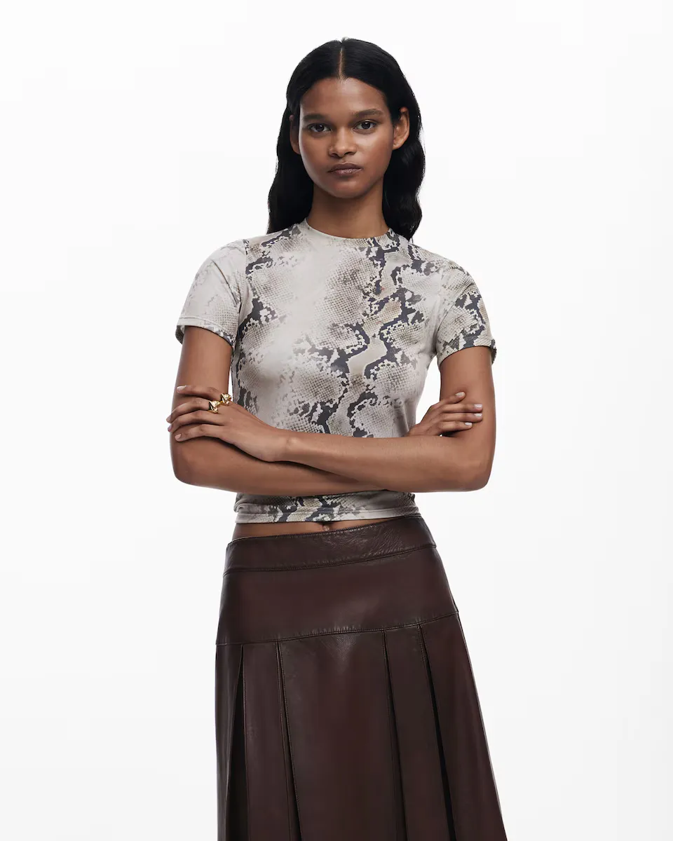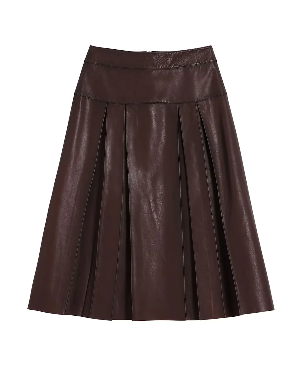 Юбка миди до колена, с боковыми складками и застежкой на молнии из переработанной кожи. Крой: Регулярный. Длина: Миди. Застежка на молнии. Переработанная кожа.