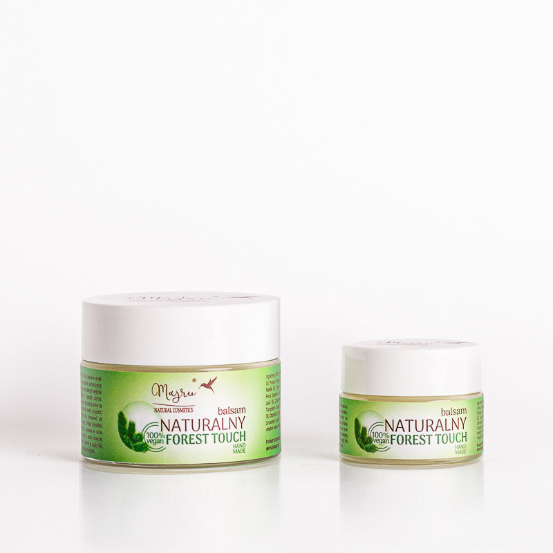 Натуральный бальзам FOREST TOUCH содержит натуральные косметические масла и масла, соевый воск, композицию из шести специально отобранных натуральных эфирных масел и витамин Е. В состав входят следующие эфирные масла: пихта, тимьян, сосна, эвкалипт, камфара и гвоздика. Благодаря этим маслам бальзам имеет очень приятный, свежий, лесно-травяной аромат, а также согревающие и ароматерапевтические свойства. Используя бальзам, мы пользуемся дарами природы — эфирными маслами, которые способны успокаивать, умиротворять и помогать при вдыхании. Бальзам имеет приятную, мягкую консистенцию и эффективную форму. Бальзам подходит для ежедневного ухода за кожей лица старше 5 лет.