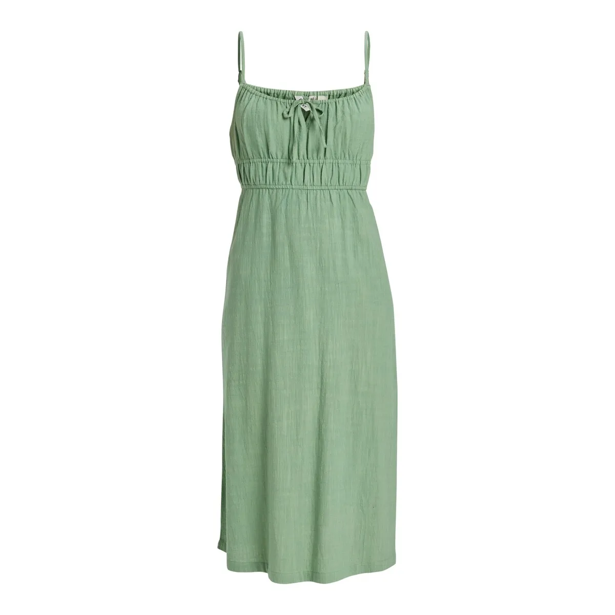 Платье средней длины для женщин. Характеристики включают: Ткань: Неравномерная смесь хлопка и вискозы (150 г/м2), Крой: Легкий облегающий силуэт, Длина: Средняя длина, Вырез: Круглый вырез, Ремешки: Регулируемые ремешки из идентичной ткани, Застежка: Застежка с передним завязыванием и Другие характеристики: Эластичные ряды на бюсте.
