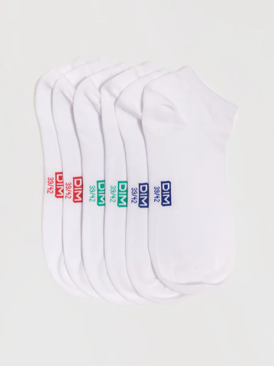 Набор из 3 пар хлопковых носок DIM. Носки в основном из хлопка, тонкие, мягкие и удобные для ежедневного ношения. Швы плоские, а манжеты не сжимаются. Носки DIM имеют усиленные пятку и мыску для большей долговечности. Интересная деталь: на подошве этих носков напечатан логотип DIM, каждая пара имеет свой цвет для удобства подбора.