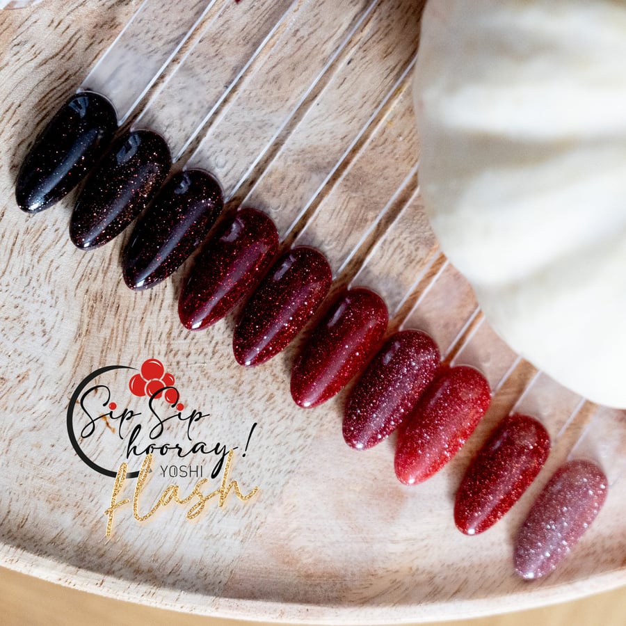 Коллекция Flash Sip Sip Hooray — это приглашение в волшебное путешествие в атмосферу осени, где каждый цвет рассказывает историю, полную тепла и элегантности. Представьте себе прогулку по золотистым плантациям, где воздух наполнен ароматом спелого винограда, а листья переливаются оттенками красного, бордового и розового. Настало время сбора урожая — время чествования природы и ее плодов, когда дни становятся короче, а вечера уютнее. Благодаря эффекту вспышки каждый из лаков мерцает, словно мерцающие огни, придавая сияние, которое украсит любую укладку. Каждое движение руки создает тонкую игру света, идеально отражающую энергию и легкость этой коллекции.