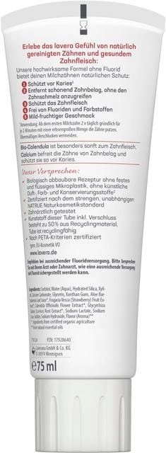 Зубная паста также содержит натуральные антибактериальные компоненты, которые помогают бороться с бактериями в полости рта и предотвращают образование кариеса. Кроме того, детская зубная паста Lavera содержит натуральные противовоспалительные компоненты, которые помогают уменьшить боль и зуд десен. Благодаря натуральным ингредиентам и ароматизаторам эта зубная паста удобна в использовании для детей. Это зубная паста без фтора, которая безопасна для детских зубов и позволяет им наслаждаться здоровыми и красивыми зубами.