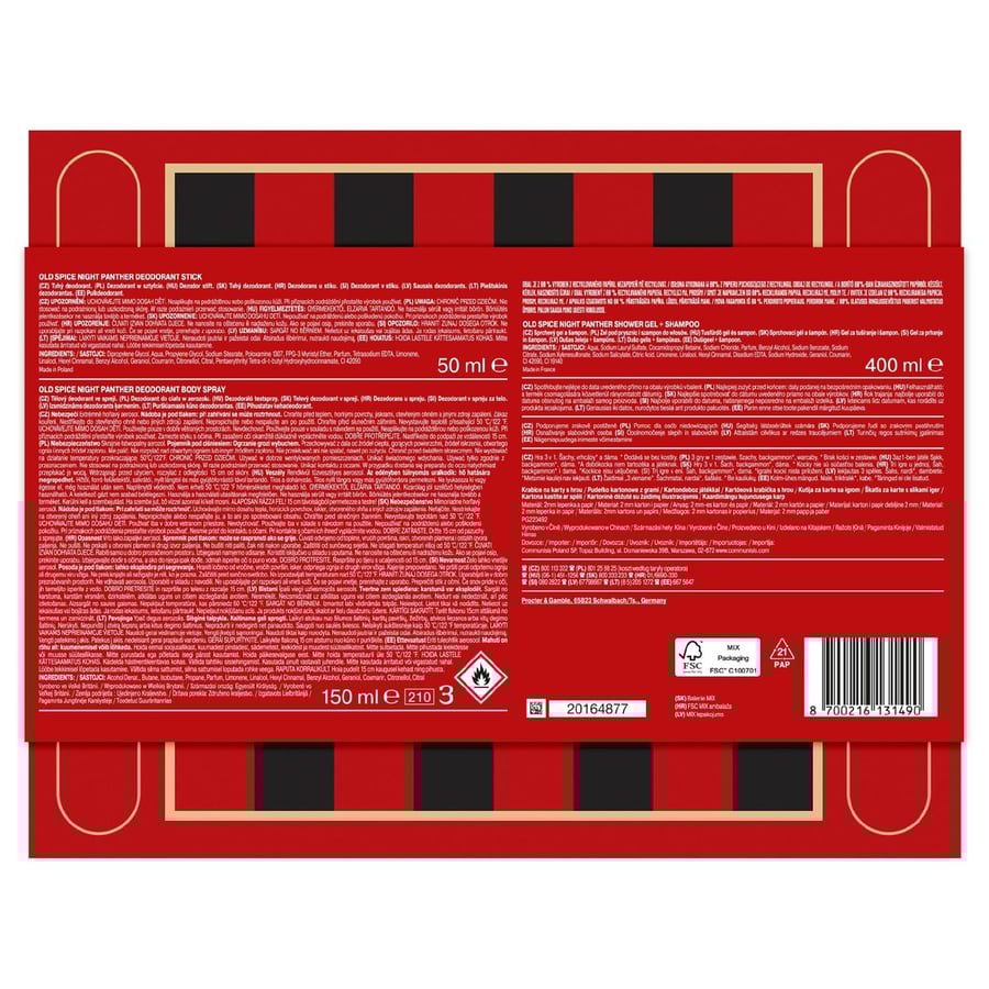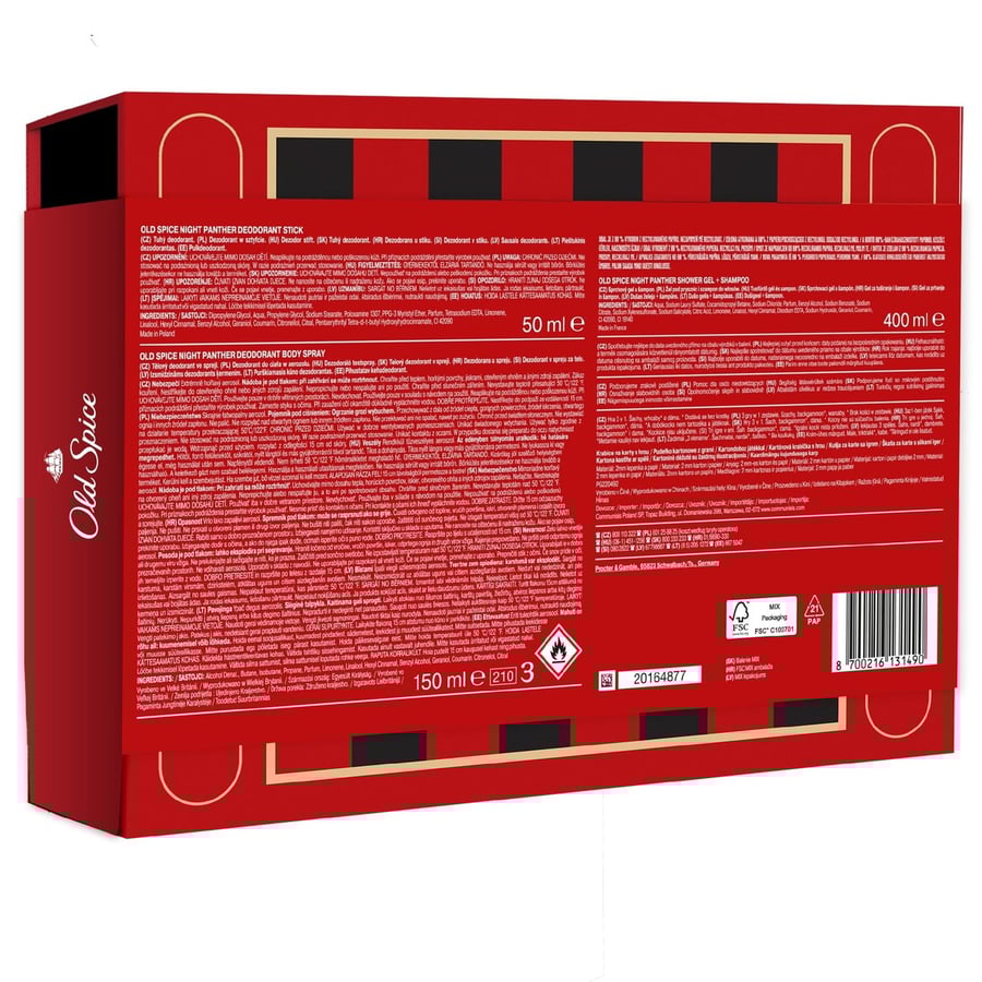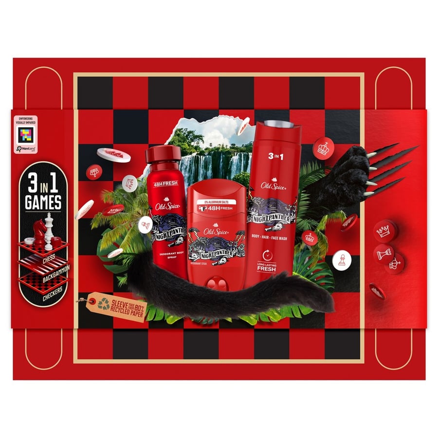 Идеальный подарок для него? Не ищите ничего другого, кроме подарочных наборов Old Spice. Подарочные наборы Old Spice — лучший способ произвести впечатление на современного мужчину: пленительные, мужественные ароматы Old Spice не разочаруют. В подарочный набор Old Spice Gamebox входят дезодорант-карандаш, дезодорант-спрей и гель для душа объемом 400 мл из серии Night Panther, а также набор из 3 культовых настольных игр — шахматы, нарды и шашки. Продукция представлена в многоразовой картонной коробке Old Spice с магнитной застежкой, в которой настоящий фанат игр может хранить свои сокровища. Продукция подарочного набора Gamebox имеет мужской аромат Night Panther, в котором присутствуют восхитительные ноты темного шоколада и ванили. Кроме того, этикетка этого подарочного набора на 80% изготовлена из переработанной бумаги и материалов, полученных из экологически чистых источников и сертифицированных FSC. Интересно, почему этот подарочный набор Old Spice для мужчин еще не попал в вашу корзину.