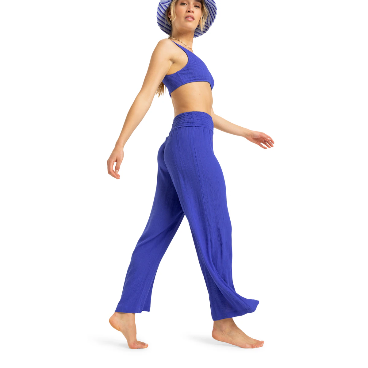 Пляжные штаны для женщин. Характеристики включают: Ткань: легкая и мятая вискоза [110 г/м2], Талия: высокая эластичная талия, застежка: сборный пояс.