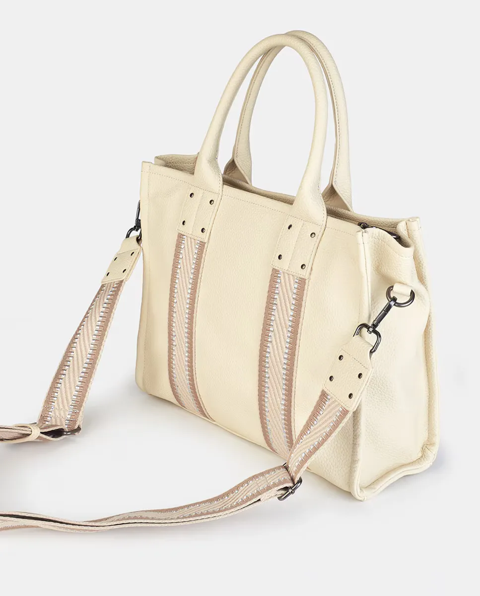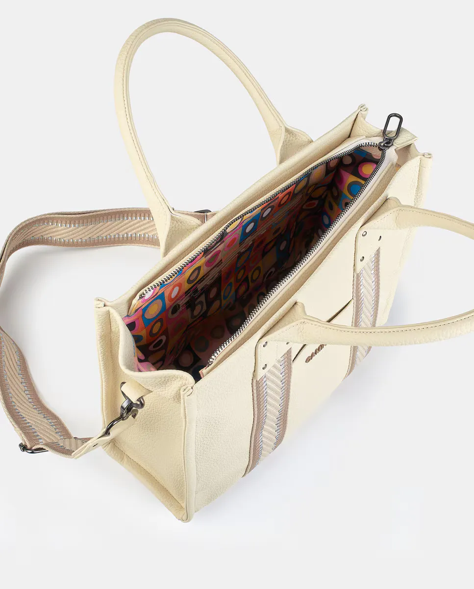 Сумка цвета слоновой кости с застежкой-молнией. Задний и внутренний карманы на молнии. Два коротких ручки и регулируемый длинный ремень с карабином.