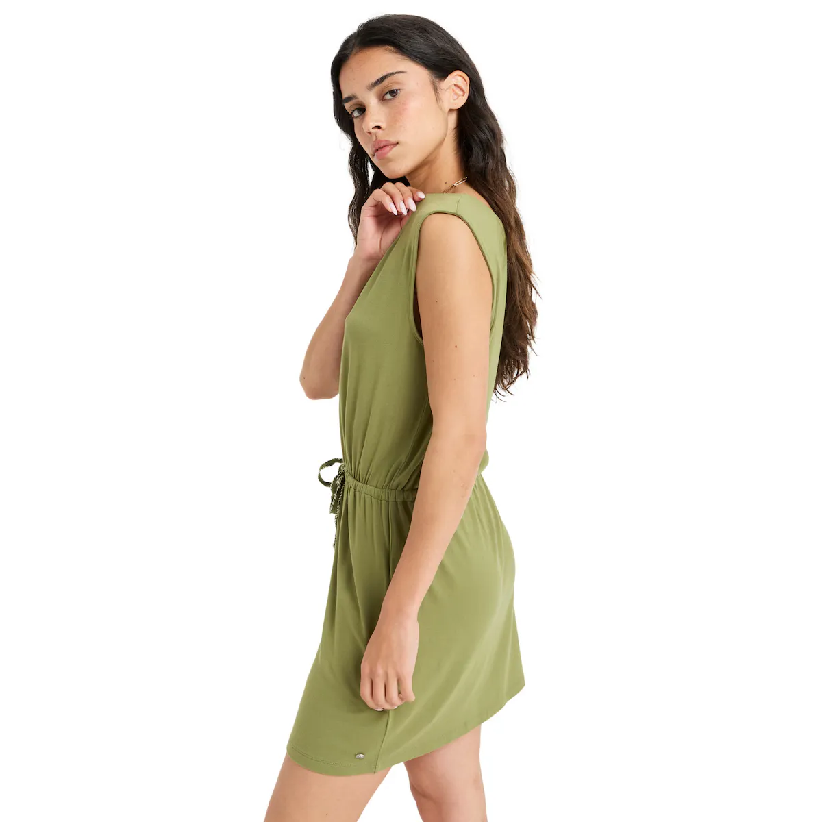 Платье средней длины для женщин. Характеристики: Коллекция: Коллекция Injection Ecom, Ткань: трикотаж, смесь вискозы и эластана [200 г/м2], крой: обычный, Вырез: круглый вырез, Закрытие: регулируемый шнурок в дизайне на талии, Длина: средняя длина и Бренд: металлическая пластина Roxy в нижней части переднего подола.