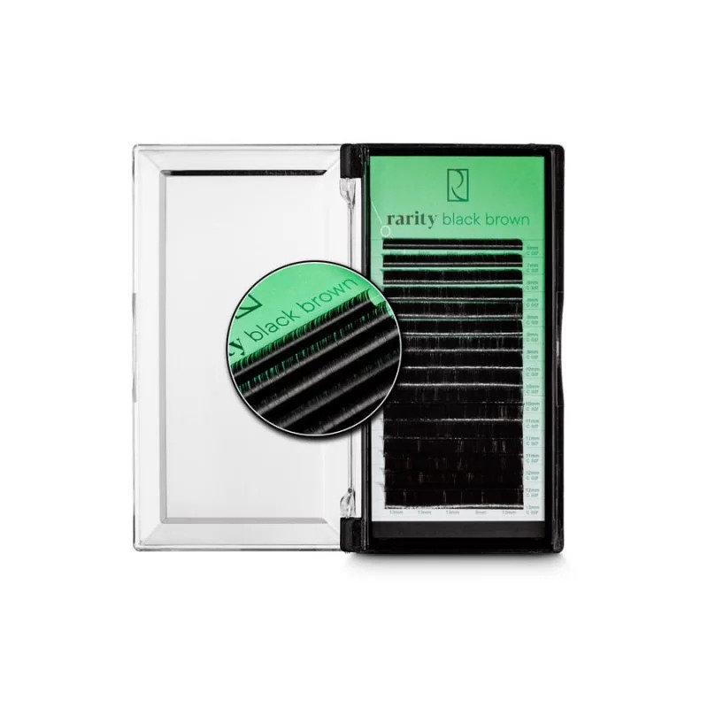 В новой кассете вы найдете 16 полосок (по 12 с изгибом L, M, R) наших надежных ресниц Rarity темно-коричневого цвета.