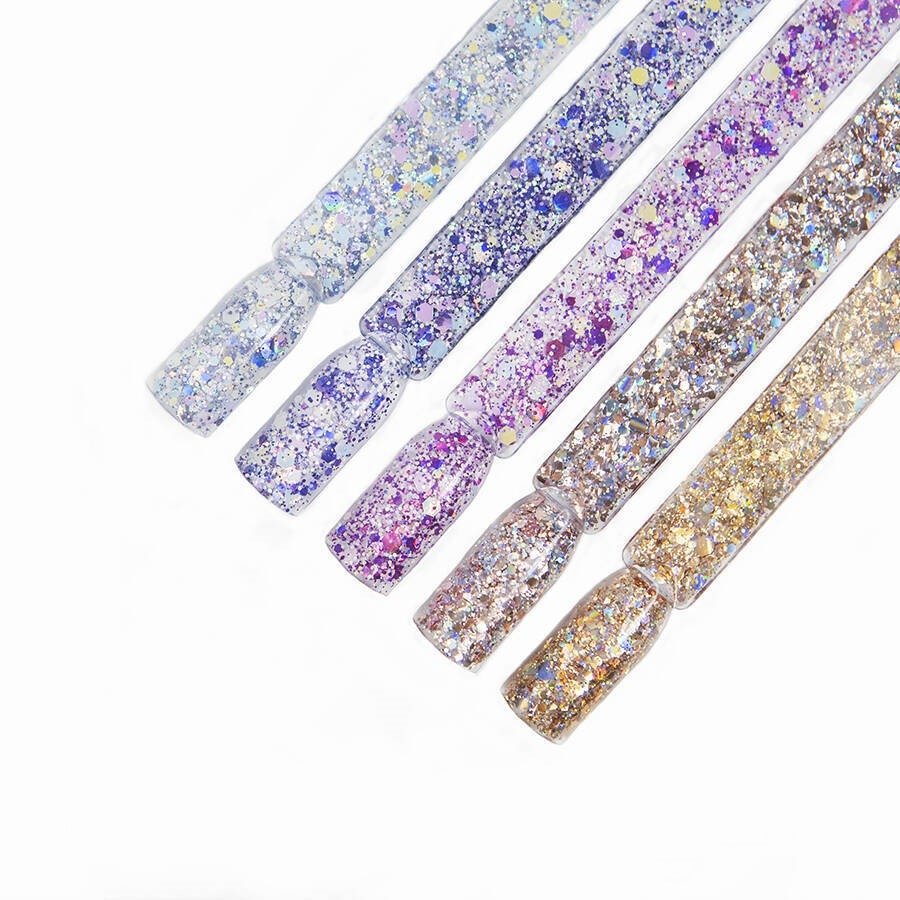 Разноцветные частички разных размеров и форм, отражая свет, создают удивительный эффект блеска, интенсивность которого можно регулировать, выбирая нужное количество частиц. Консистенция геля средней густоты, что облегчает его распределение, особенно вокруг кутикулы. Гель доступен в 5 цветах.