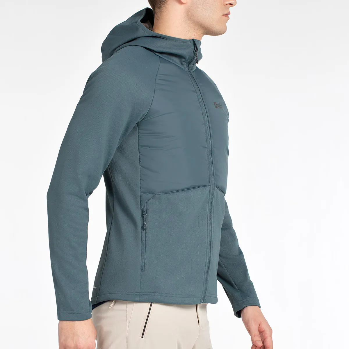 Гибридная строительная одежда. Передняя часть выполнена в сэндвич-конструкции с синтетическим наполнителем и внешней тканью из нейлона рипстоп, остальная часть изделия изготовлена из двустороннего трикотажа 100% полиэстера с флисовой подкладкой. Прямой подол с регулировкой на танках, боковые карманы на молнии.