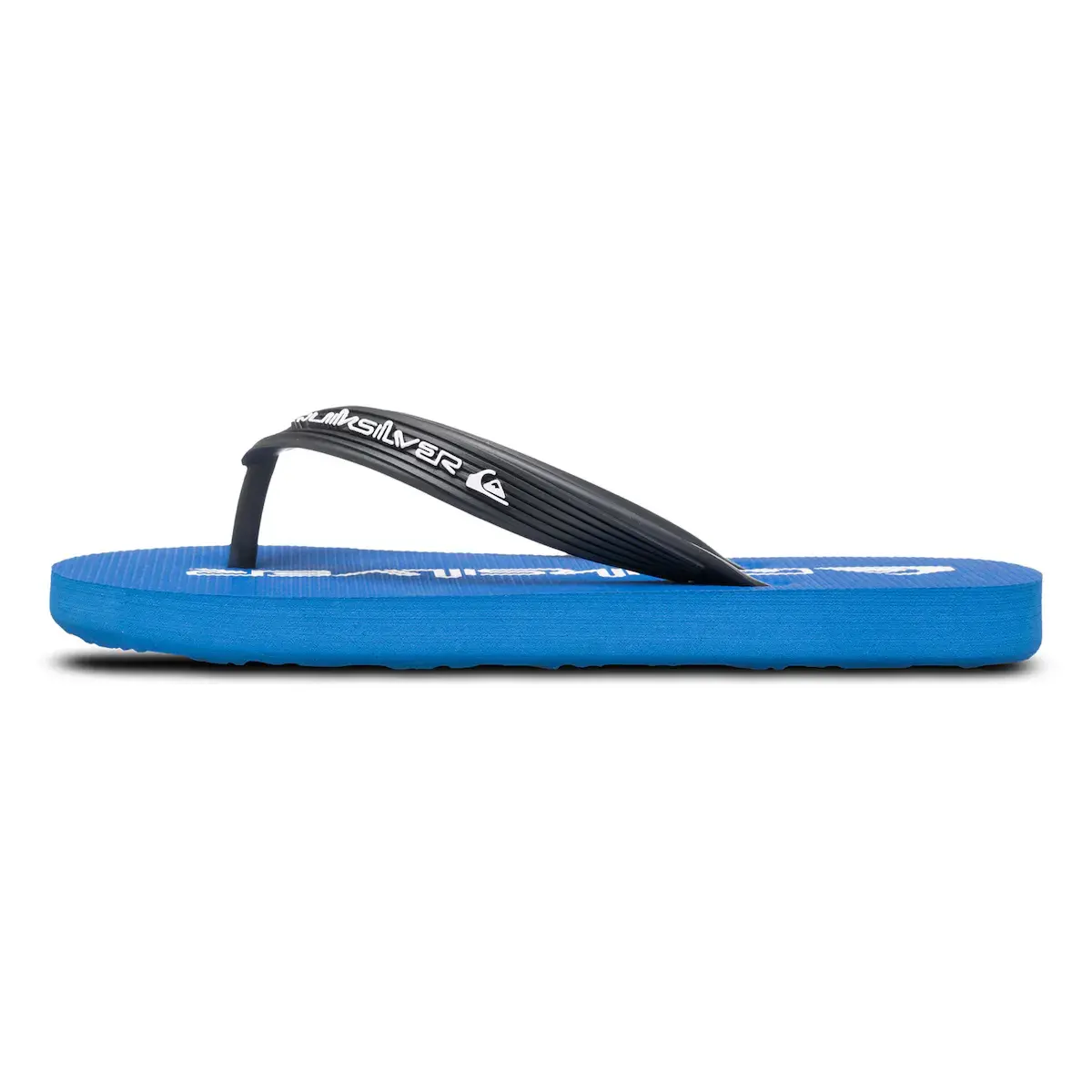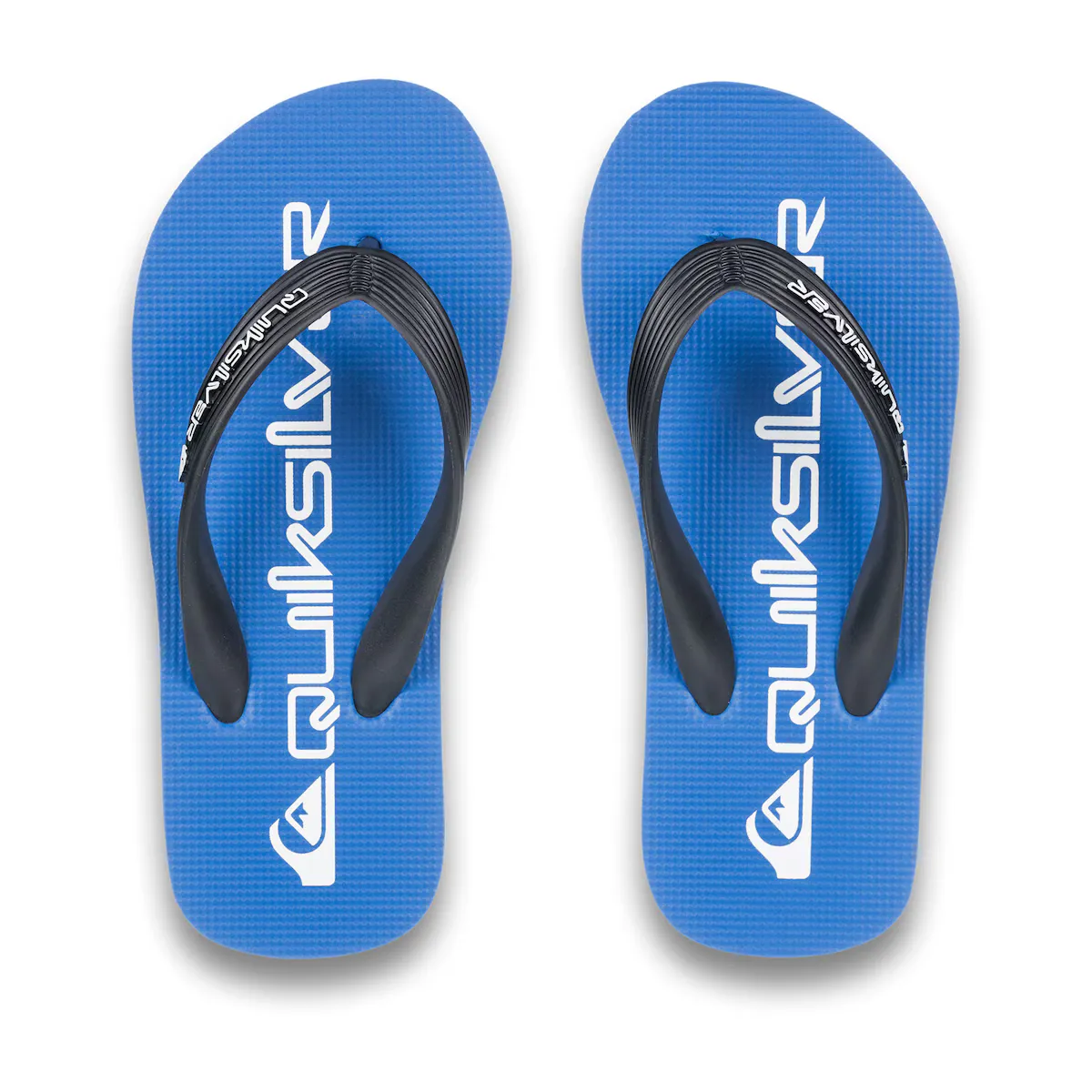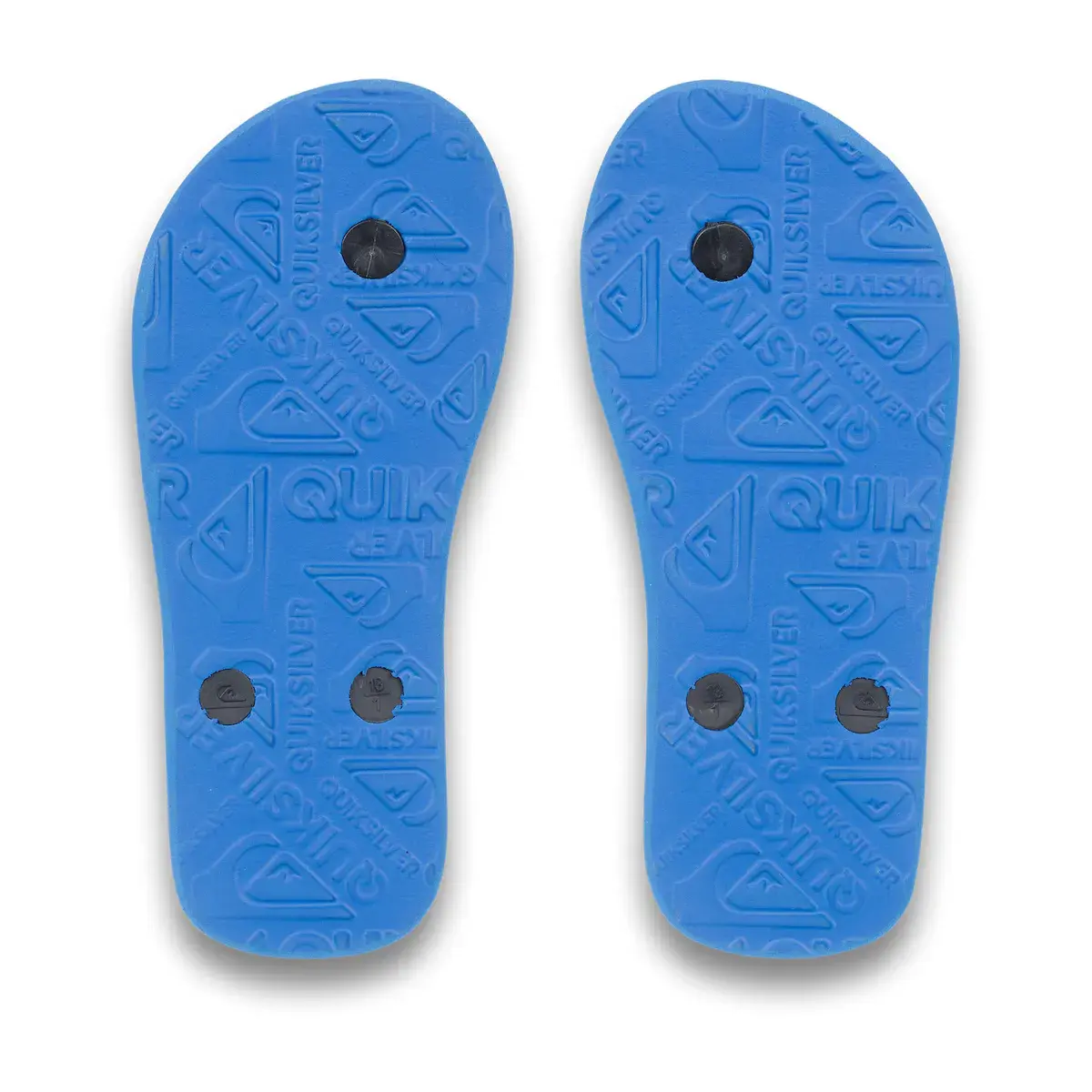 Шлепанцы для детей. Характеристики включают: гибкий резиновый ремешок из синтетического материала с тремя точками и логотипом Quiksilver и Mountain Wave, подошва с антискользящим текстурированным покрытием и внешняя подошва из надувной резины с многоугольными выемками и логотипом для лучшего сцепления.