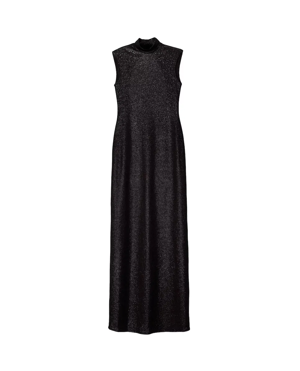 Эластичное трикотажное платье с блестящим люрексом, высоким воротником и разрезом на спине. Этот дизайн без рукавов, с разрезом на задней части юбки для большего комфорта. Это элегантное платье, подчеркивающее силуэт, идеально подходит для выхода на специальные вечерние мероприятия. Подкладки нет.