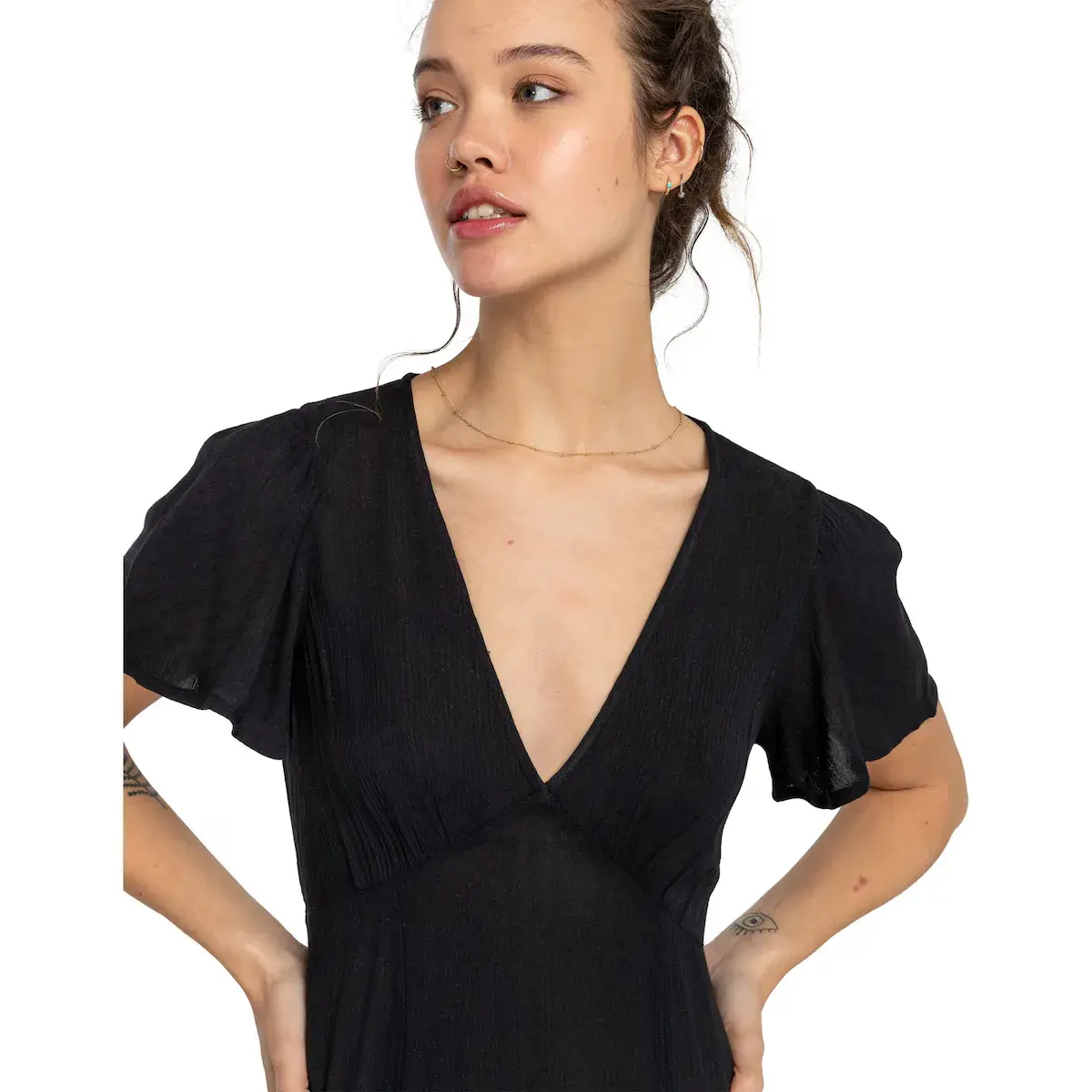 Платье средней длины для женщин. Особенности включают: Коллекция: Возвращение в рай, жаккардовая ткань из вискозы, облегающий силуэт, V-образный вырез, короткие рукава с воланами, Бренд: Металлическая пластина, Другие особенности: юбка с фронтальным разрезом и вырезом на задней части воротника.