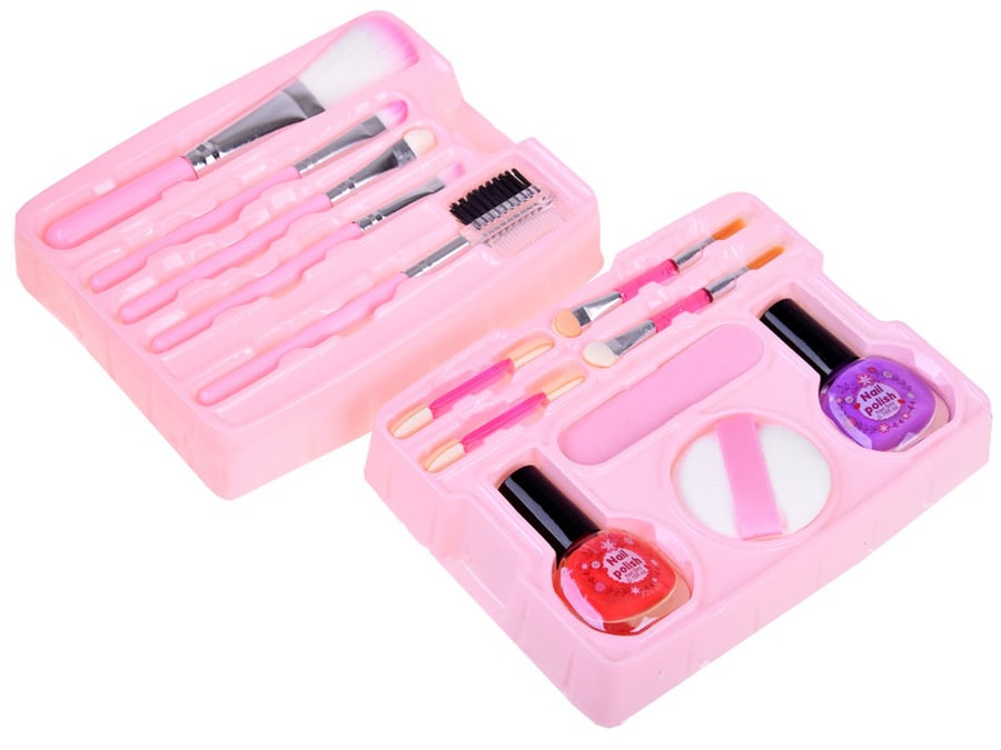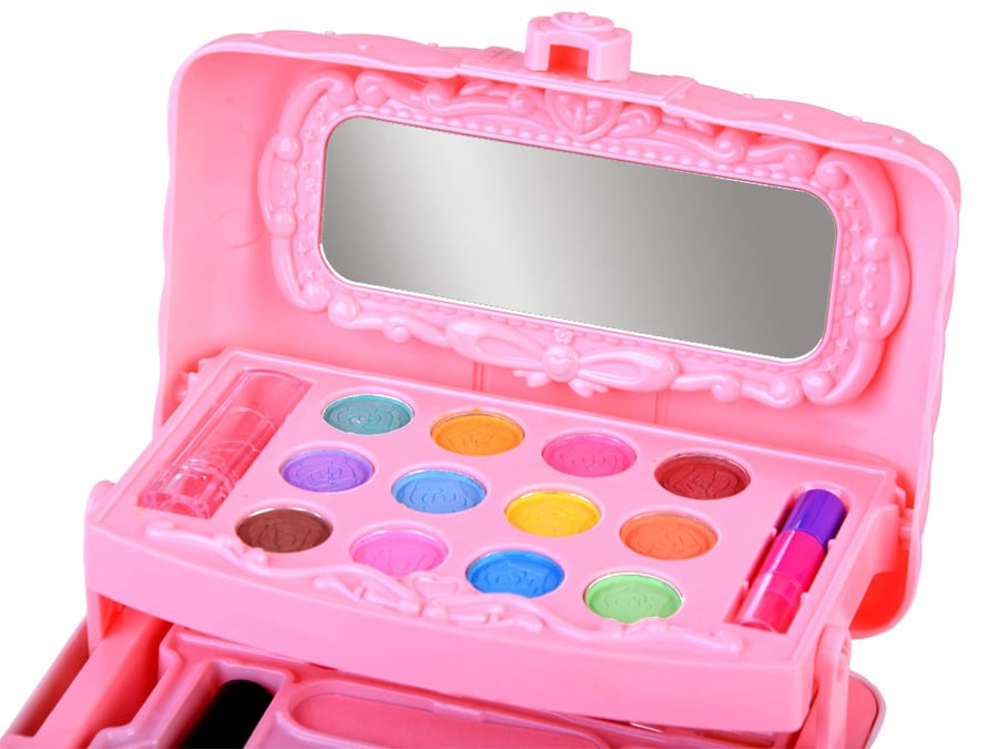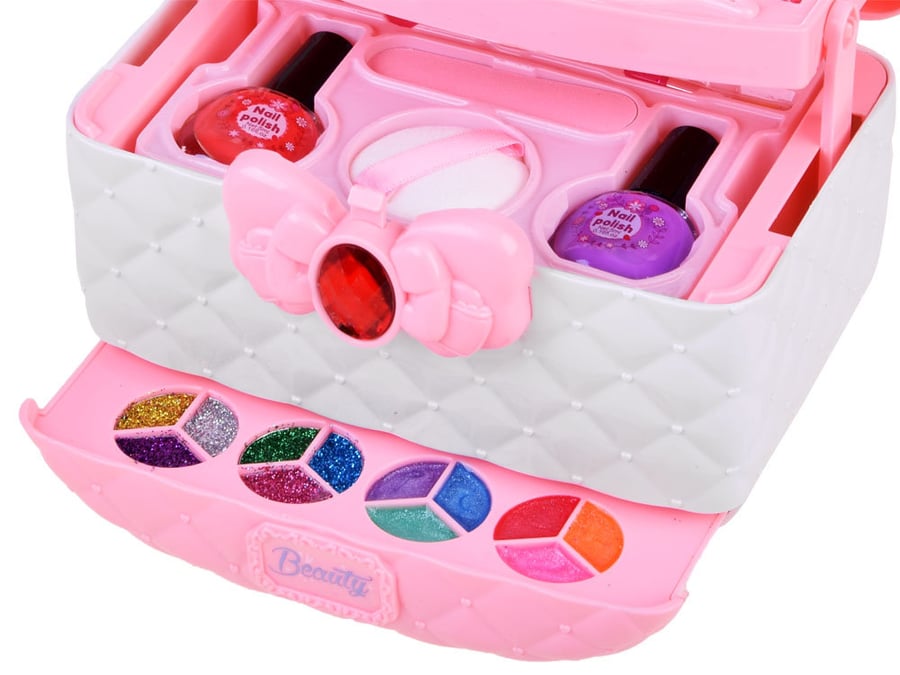 - второй ящик имеет двойную внутреннюю часть. В одном футляре находятся пять кисточек для макияжа, а в другом - 4 аппликатора для теней, спонж для пудры, пилочка для ногтей и два лака для ногтей. В третьем ящике находятся 12 цветов блесток, мерцающих частиц и блесков для губ. Также в футляре есть безопасное зеркало, в которое вы можете посмотреть на себя. Кроме того, в набор входят две коробки-сюрприза, в которых вы найдете разноцветные резинки для волос, пластиковое кольцо, застежку, наклейки для ногтей. Размеры футляра: - 19 x 13 x 16 см. Все аксессуары для макияжа безопасны для детей. Игрушка упакована в красивую красочную упаковку, идеально подходящую для подарка. Такая косметичка — настоящая радость для каждой девушки.