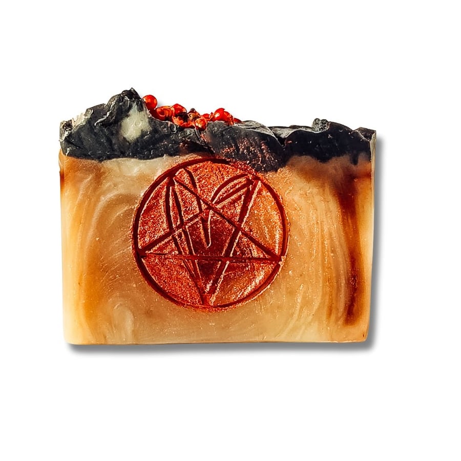Как и все наши мыла, это мыло изготовлено вручную из чистых растительных масел. Мы также добавили множество питательных экстрактов, трав, интенсивно очищающий уголь, соль и мыльную алхимию... (демонические коннотации появляются после первого использования)