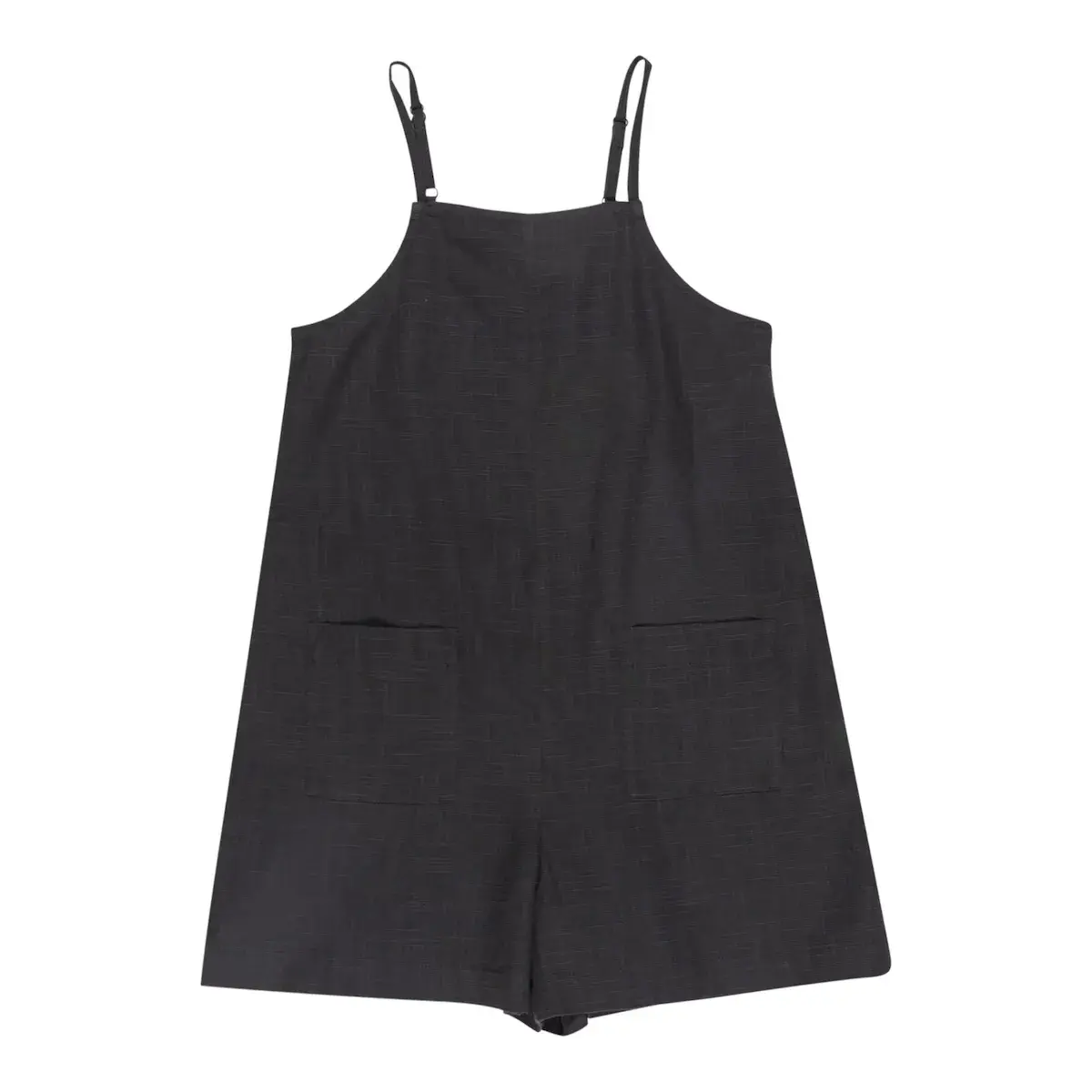 Короткий комбинезон на бретелях для детей (от 4 до 16 лет). Характеристики включают: Ткань: смесь хлопка и вискозы (150 г/м²), Крой: свободный, Воротник: квадратный, Ремни: регулируемые, Карманы: накладные передние карманы, Длина: укороченная длина с ножкой, и Застежка: фиксированная застежка.