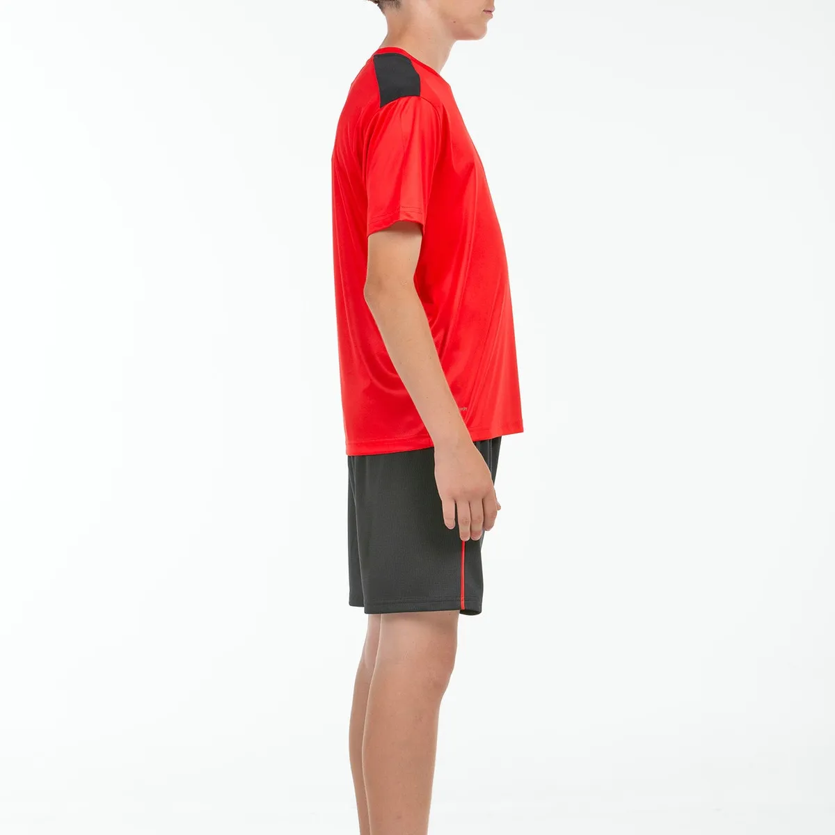 Комплект для мальчика с футболкой из полиэстрового интерлока с графикой спереди и контрастным воротником. Бермуды из ткани полиэстеровой сетки с боковыми вставками в тон футболке и отражающим логотипом. С боковыми карманами, эластичным поясом и внутренним шнурком. Имеет отделку Quickerdry.